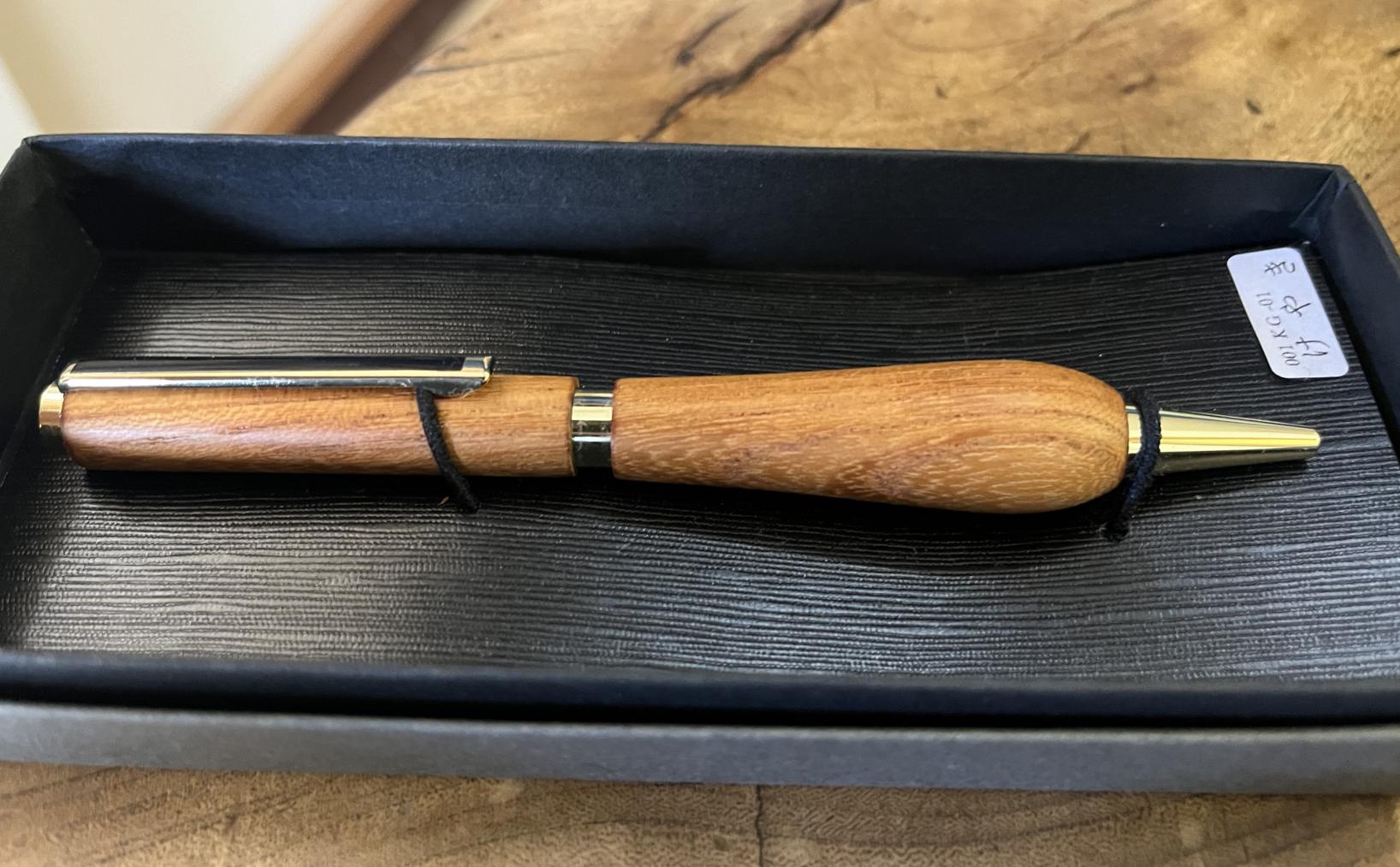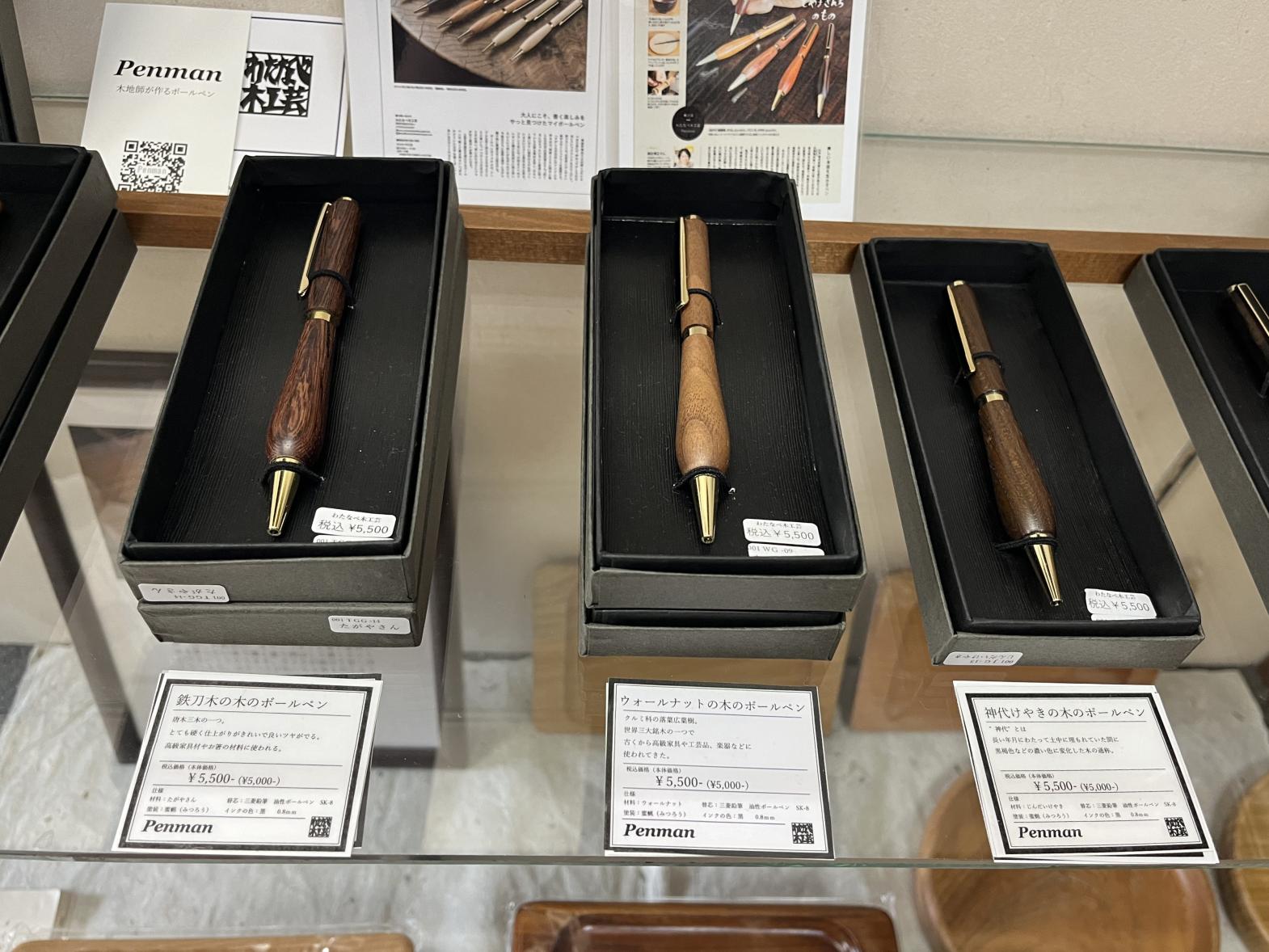 2020年からのコロナ禍で県外への移動が難しくなり、催事も中止が相次いだ。あちこち行商に回る普段通りの生活ができなくなったある日、作業場を片付けていると、挽物に使用されない小さな木材が目に入った。サイズは規格外だが、細かい杢目や色は美しい。時に世間はSDGsといった持続可能な社会を目指す認識が広まり、その考えを取り入れた製品が付加価値を高めつつあった。渡辺さんは捨ててしまう端材を使ってボールペンを作ってみようと考え、試行錯誤の結果、「木地師が作るボールペン」として商品化した。