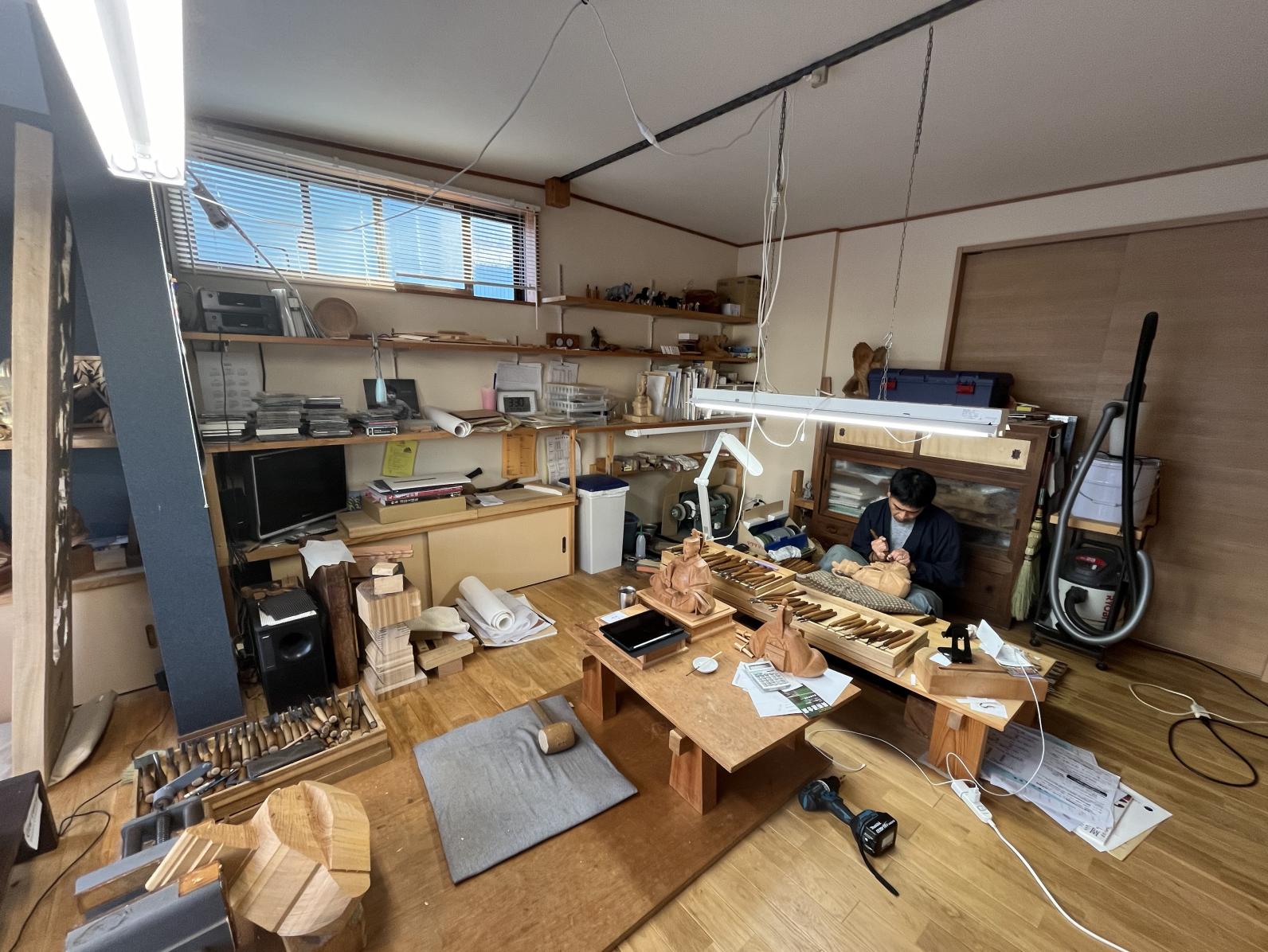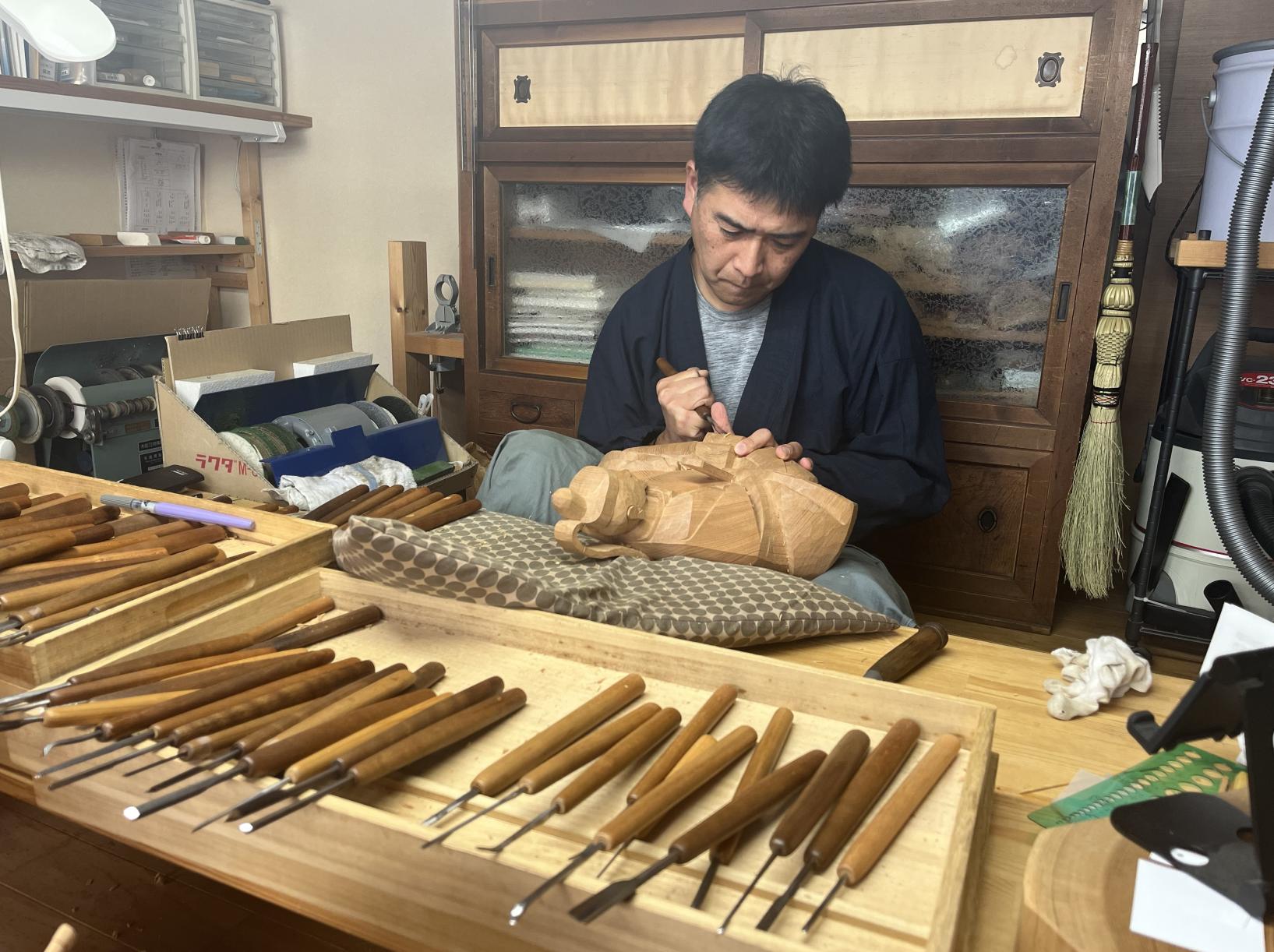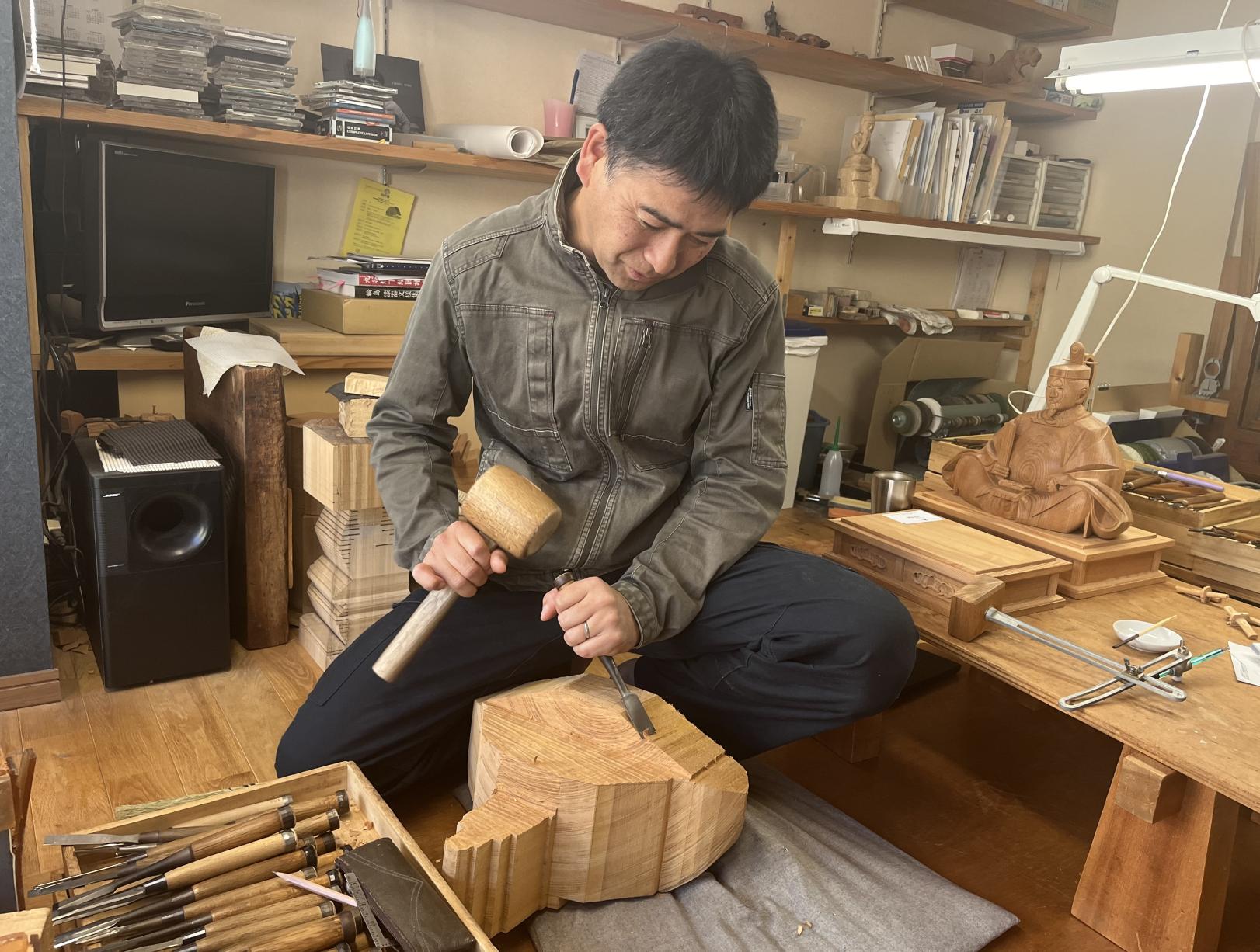 「日本一木彫刻師が多い井波という町に受け入れられ、周りの人に支えられてなんとか生きています。これからも伝統的な彫刻作品をずっと作り続けたい。死ぬまでやり続けられれば幸せです」