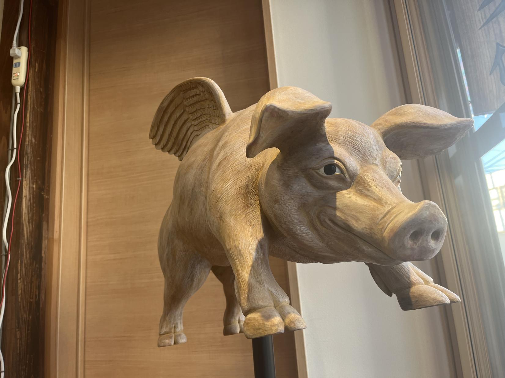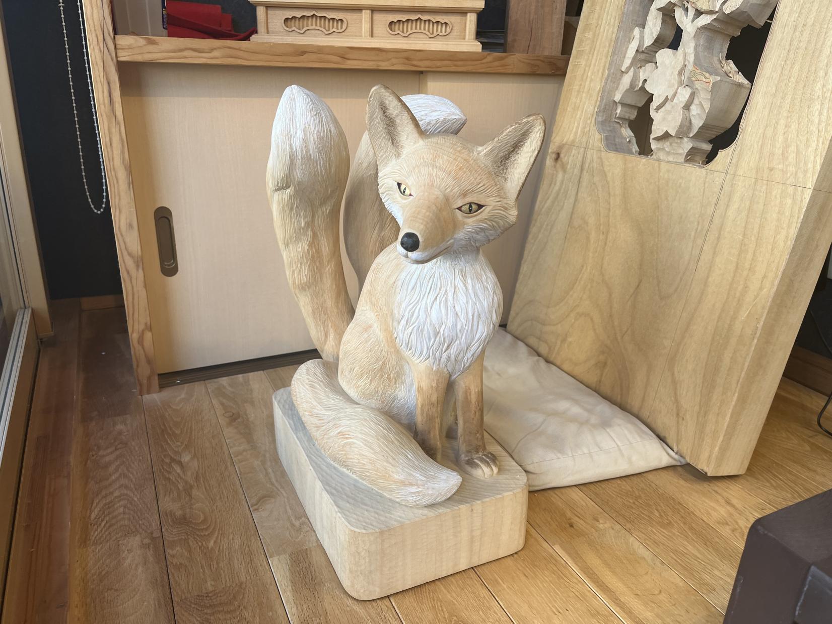 また、動物をモチーフにした作品も得意で、久保さんの工房には、九尾の狐ならぬ三尾の狐や、翼が生えた豚などの作品が、愛らしい表情を豊かに見せて展示されている。