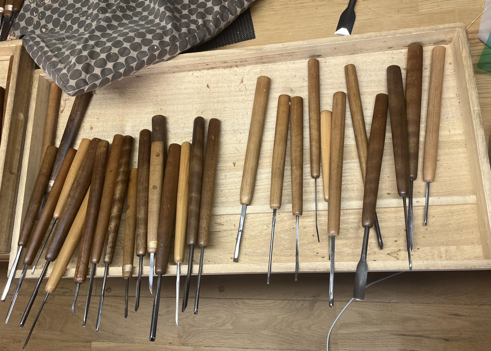 井波彫刻師は200本以上のノミと彫刻刀を持つとされるが、久保さんの道具は300本を超える。ずらりと並ぶ道具を素人目から見ても、一つ一つの特徴を覚えるのも大変だろうし、どれがどう違うのかさっぱり分からないと思うばかり。持つ際の手に馴染む感覚や、刃物の軟鋼の度合いによって使い分けており、この繊細さが高い芸術性を生み出しているのだ。毎年何本かを追加するそうで、道具一つにもこだわり、技術に力を注ぐ職人気質が垣間見えた。