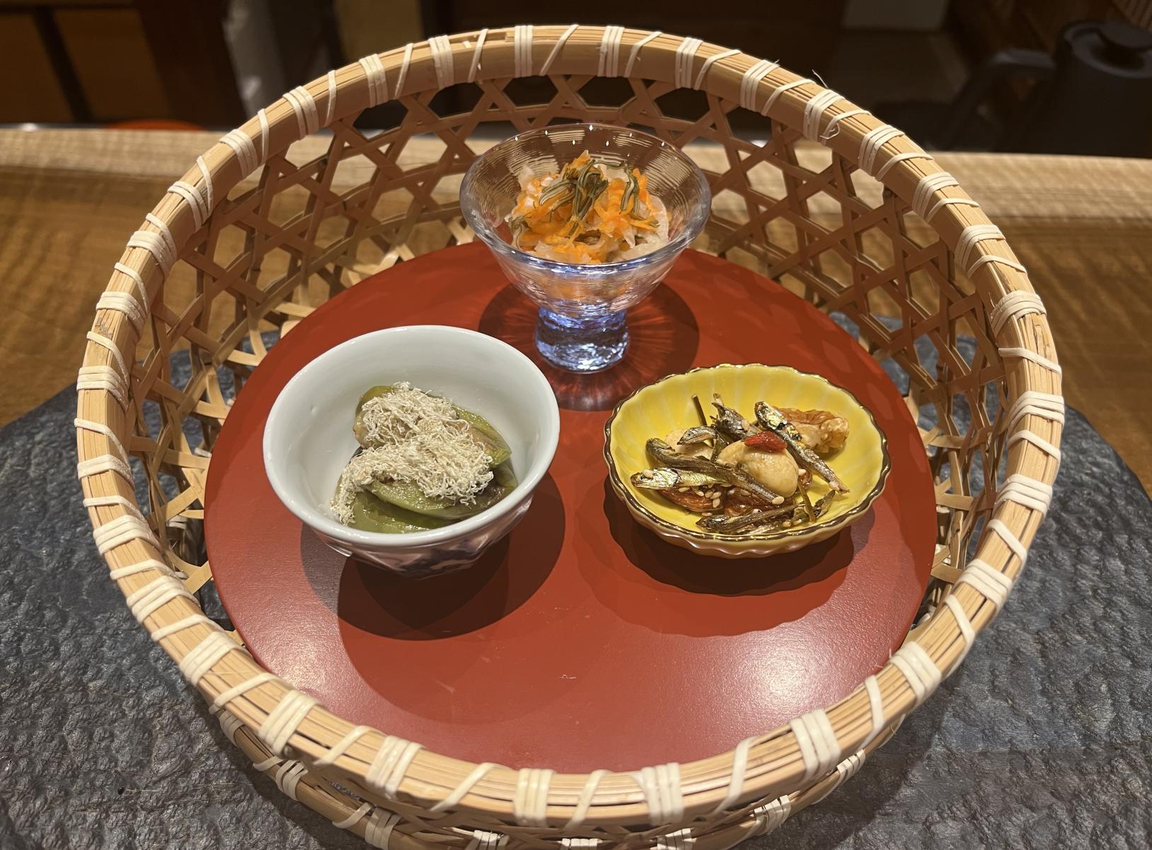二品目の薬膳三種盛りは、甘酢のあえ物のおすわい、キビナゴの田作り、ズッキーニとナスの焼き浸しといった家庭でなじみの料理に昆布を合わせている。