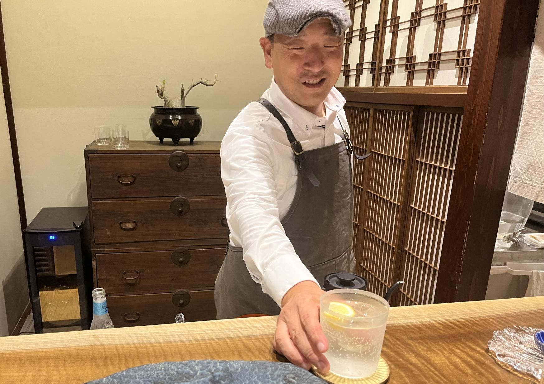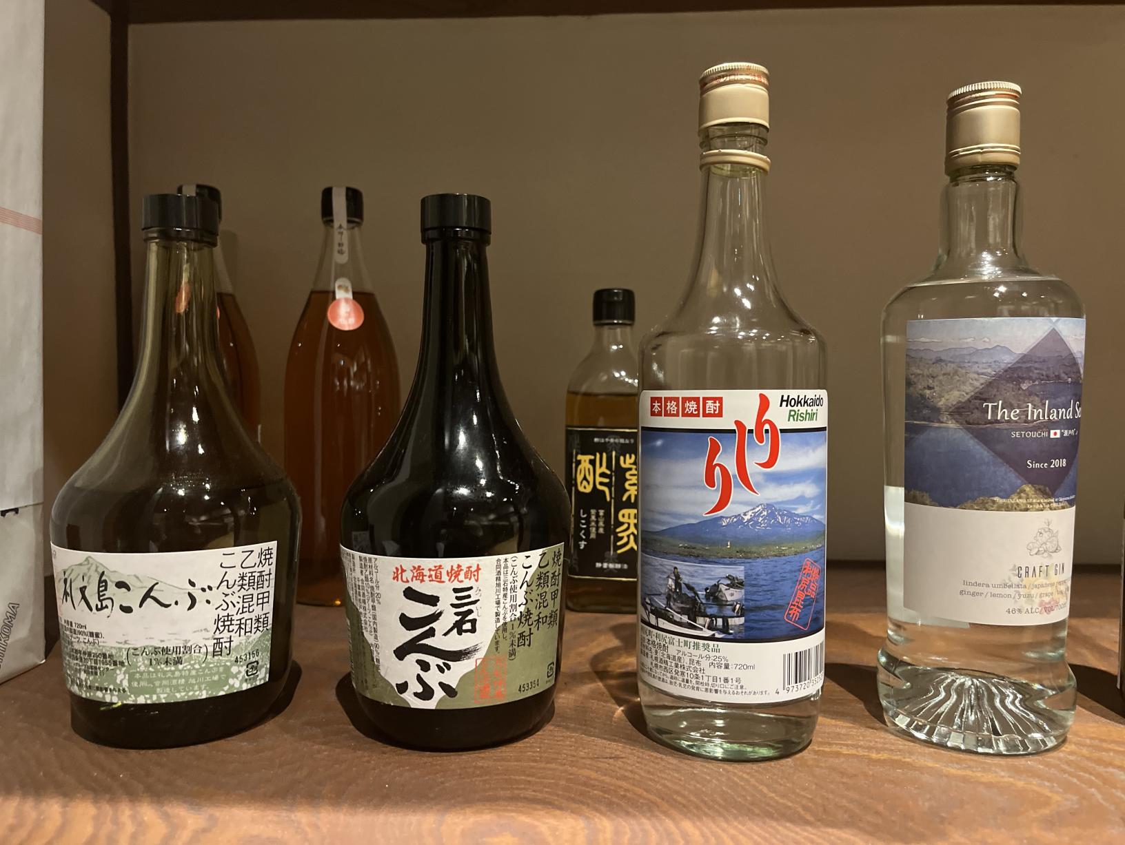 三品目は富山県民好物の昆布締めの刺身。甘エビと真鯛が締められ、うまみが染みわたっている。カウンター奥には昆布焼酎の瓶がずらり。たまらずお酒を頼みたくなったが、運転手のため昆布エキスの入ったノンアルコールジントニックを注文する。