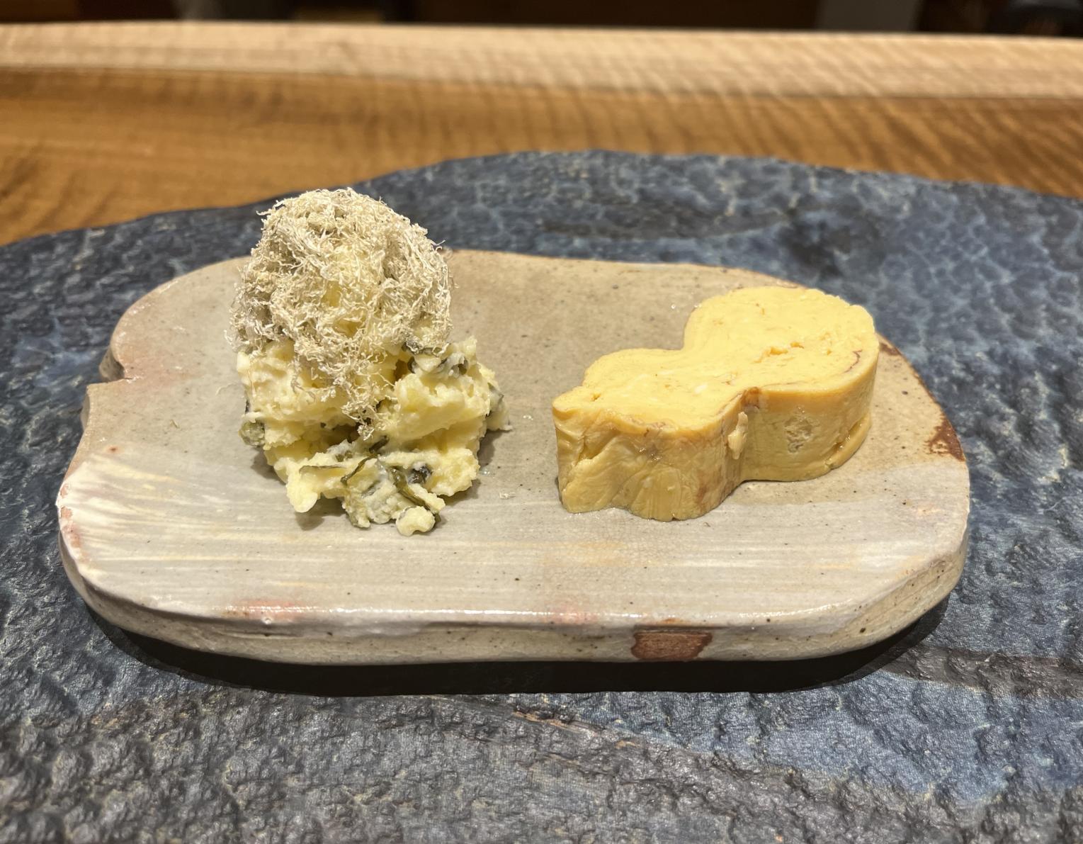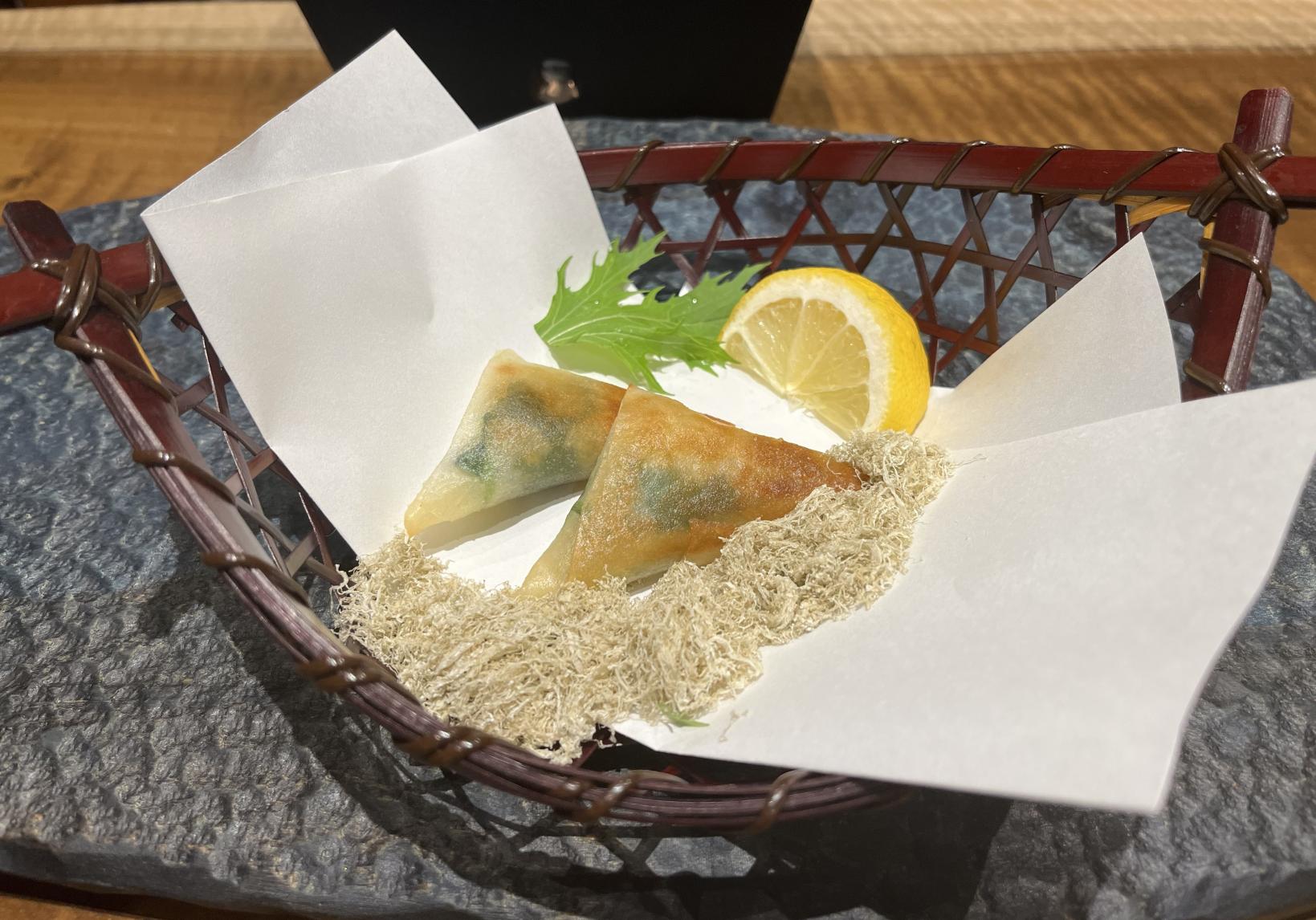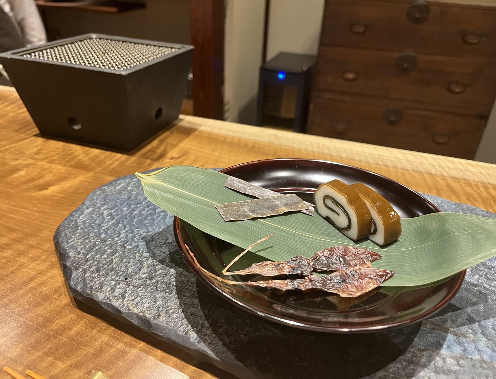 柔らかな味わいのジントニックのグラスを傾けつつ、四品目のポテトサラダとだし巻き玉子、五品目の羅臼昆布、ホタルイカ、かまぼこの炙りセット、六品目のとろろ昆布をあしらった春巻きを食べ進めていく。