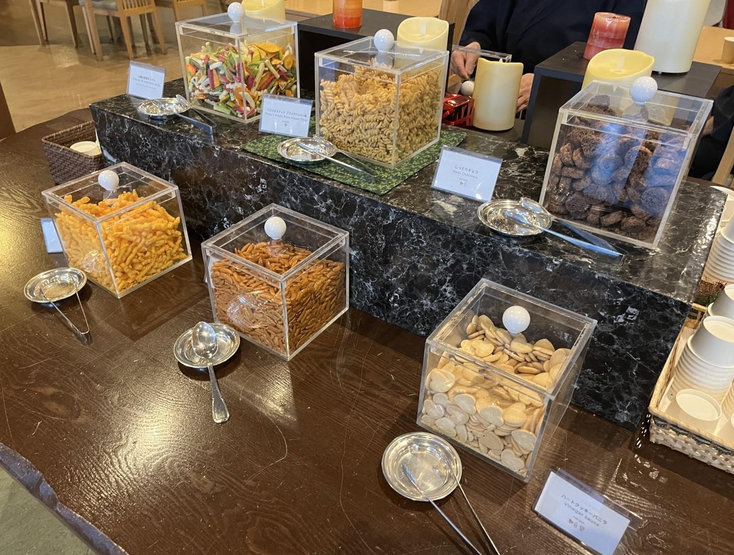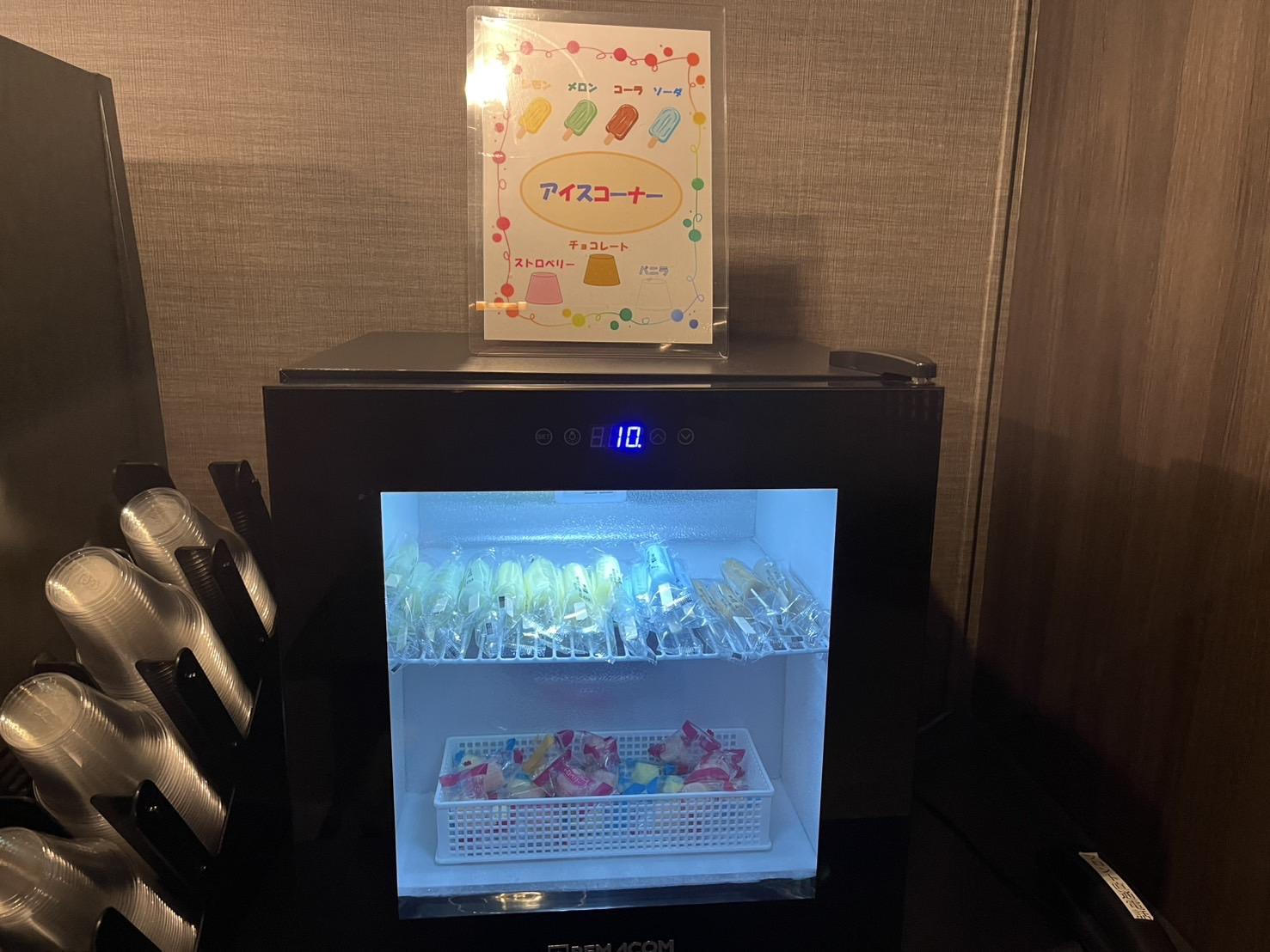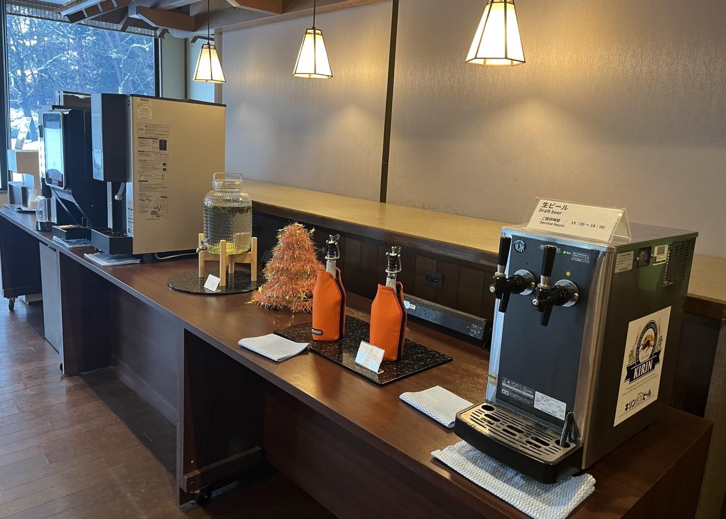 部屋へ向かうエレベーターの近くにはラウンジがあり、ソフトドリンクやアルコール飲料とつまみが提供されている。ラウンジは15:00~18:00と21:00~23:00の2部制で、アルコールは1部(15:00~18:00)が生ビールとスパークリングワイン、2部(21:00~23:00)はウォッカやウィスキー、焼酎などが楽しめる。ソフトドリンクは1・2部ともに利用できる。つまみは柿の種やスナックのほか、グミやクッキーといった甘菓子もあり、風呂上りの一杯や、夕食後の団らんに最適だ。