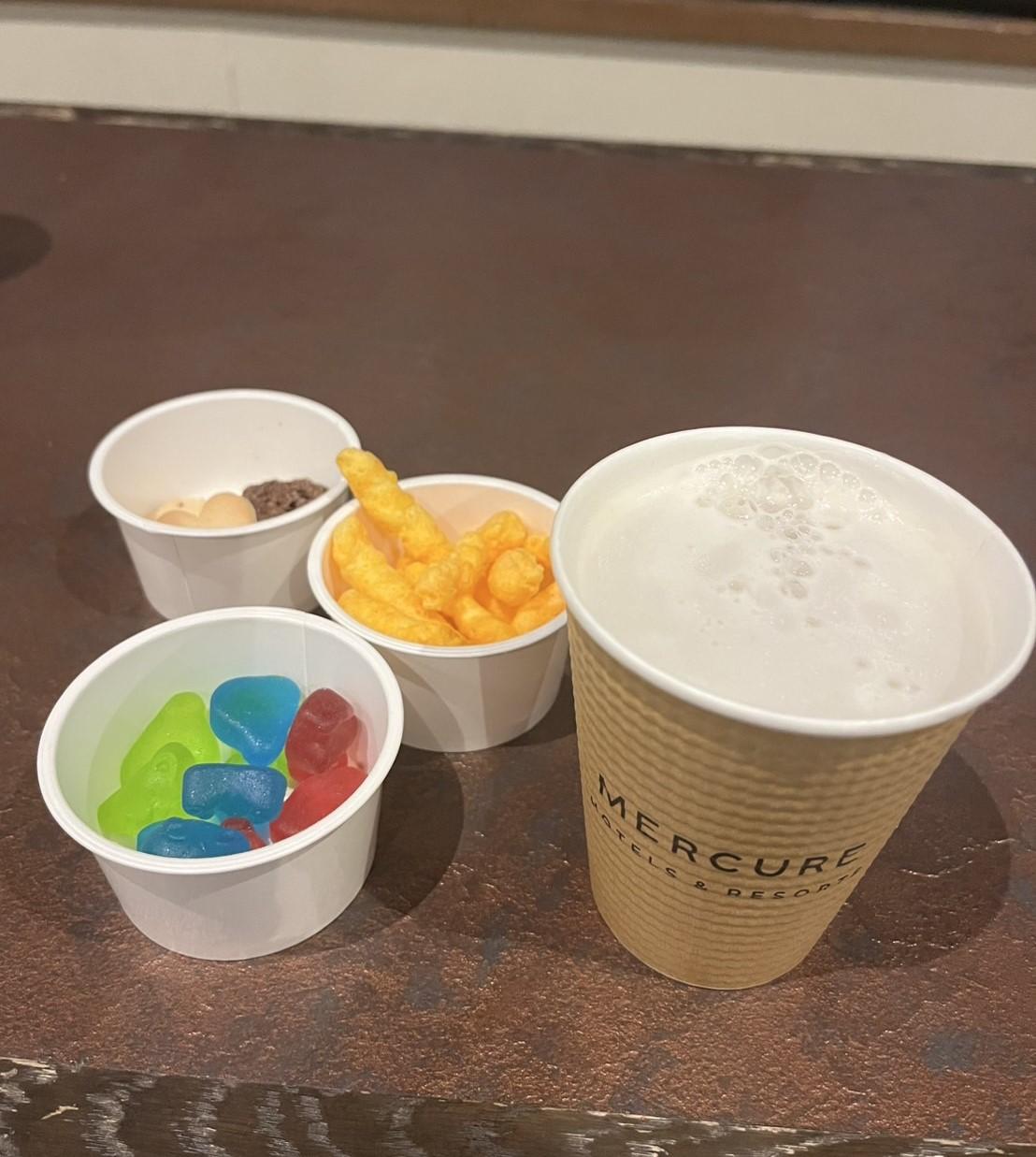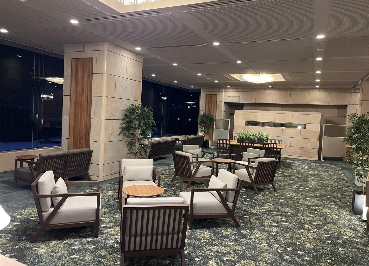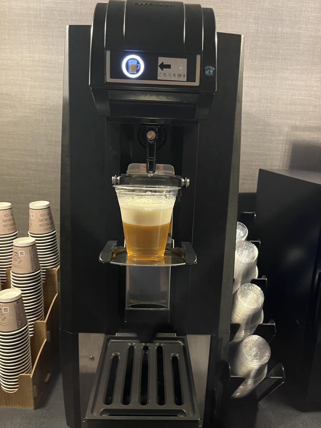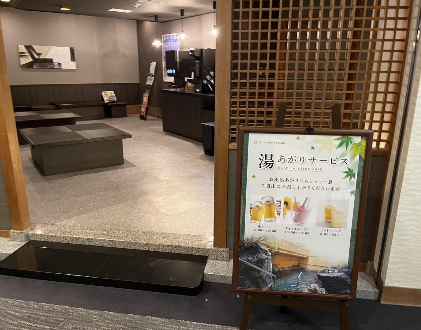 部屋へ向かうエレベーターの近くにはラウンジがあり、ソフトドリンクやアルコール飲料とつまみが提供されている。ラウンジは15:00~18:00と21:00~23:00の2部制で、アルコールは1部(15:00~18:00)が生ビールとスパークリングワイン、2部(21:00~23:00)はウォッカやウィスキー、焼酎などが楽しめる。ソフトドリンクは1・2部ともに利用できる。つまみは柿の種やスナックのほか、グミやクッキーといった甘菓子もあり、風呂上りの一杯や、夕食後の団らんに最適だ。