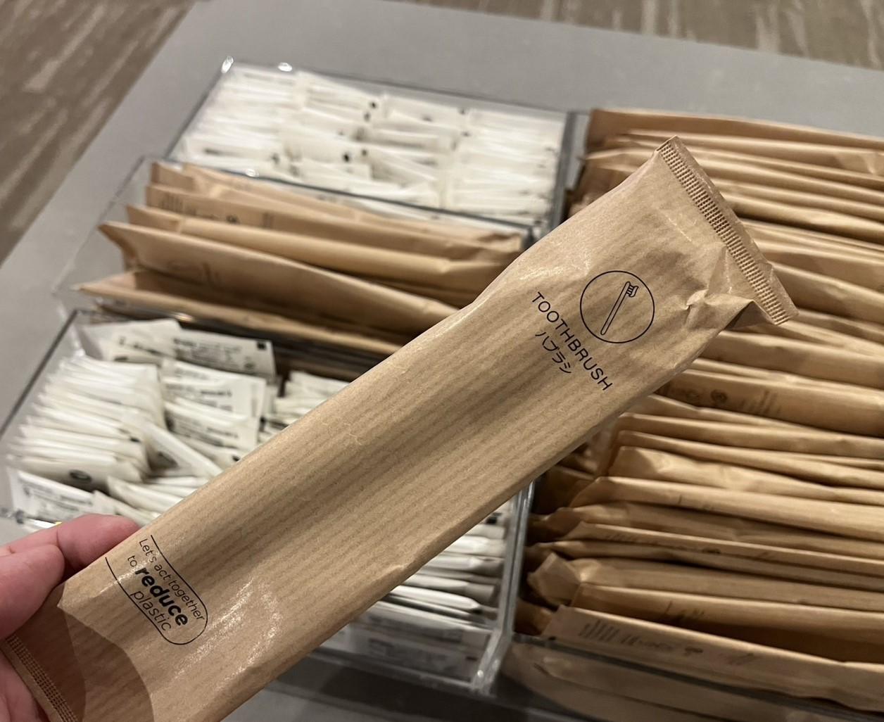 客室は洋室ツインルームと和洋室、和室がメイン。広さは35平方メートルとゆったりで、砺波平野が見渡せる。部屋着や歯ブラシなどのアメニティは、チェックイン後にフロント横のコーナーから必要なものを持ち出すスタイル。アコーグループのホテルは使い捨てプラスチックの削減を掲げており、例えば歯ブラシについては、持ち手の部分を竹で代用するなどしている。