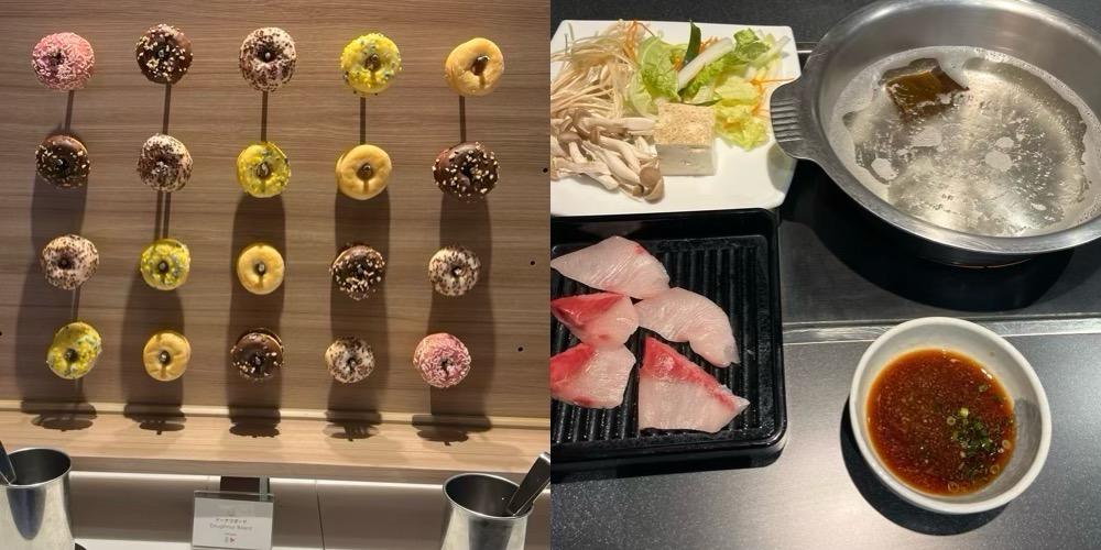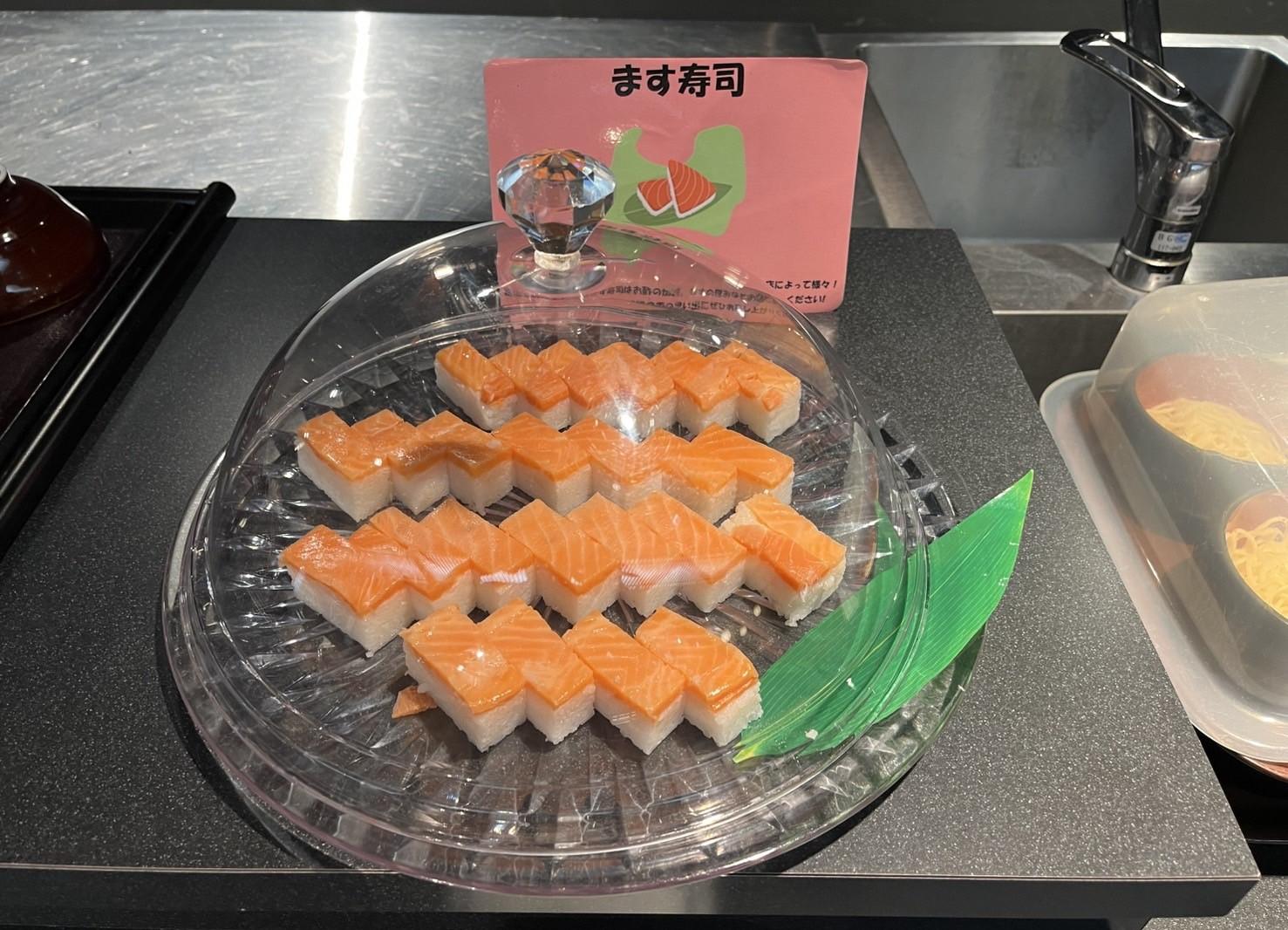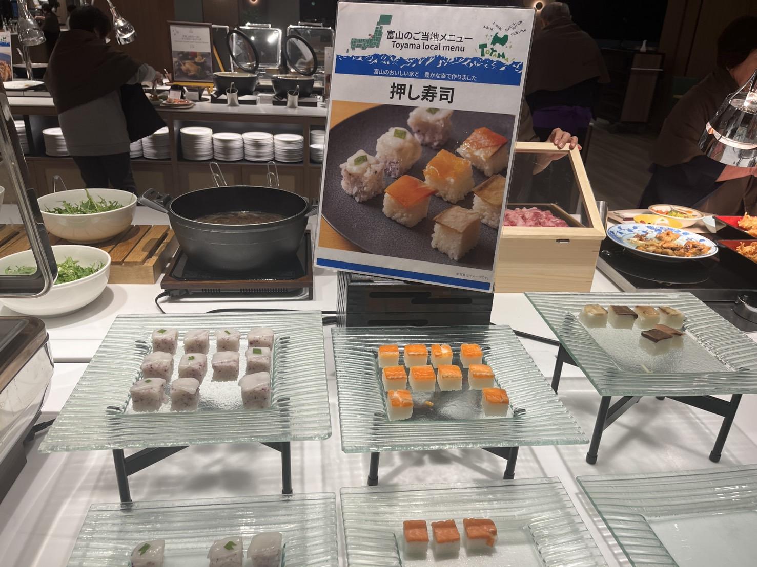 楽しみにしていたのは評判の良いビュッフェの食事。まずは夕食から。レストラン会場は約300人が入れる広さで、席を確保してから食事を取りに行く。和洋中のほか、珍しい多国籍料理が並ぶ様子に心が弾む。中でも地元富山の料理にこだわっており、この日はブリをはじめとした刺身やブリ大根、マスなどの押し寿司、白エビのかき揚げ、富山ブラックラーメンなどが提供されていた。