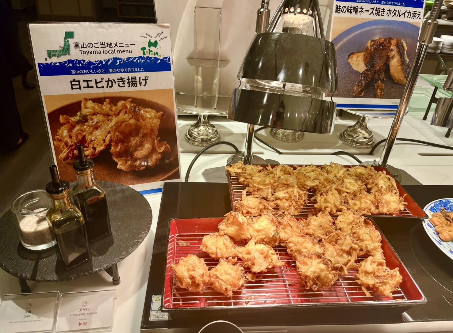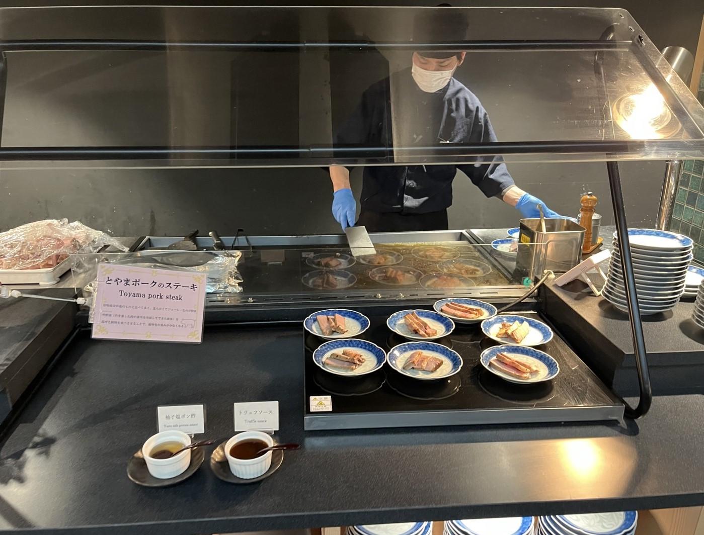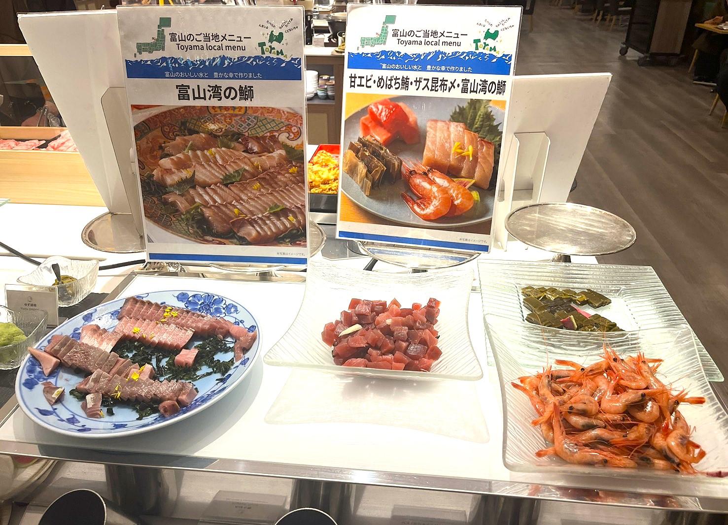 ビュッフェにはこのほか、地元富山メニューとして、目の前で焼くとやまポークのステーキやます寿司、シロエビのから揚げ、富山ブラックラーメンなどがそろう。