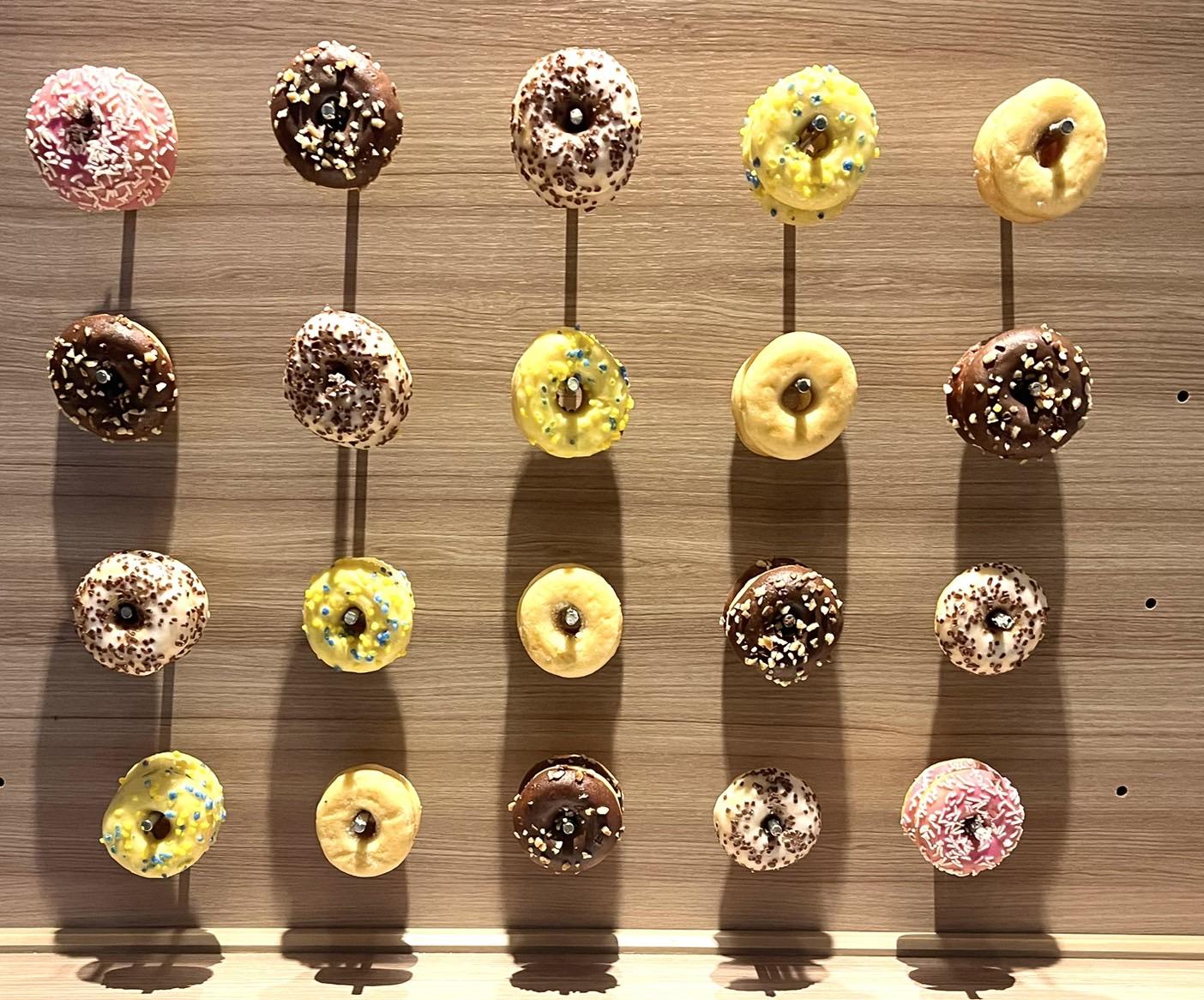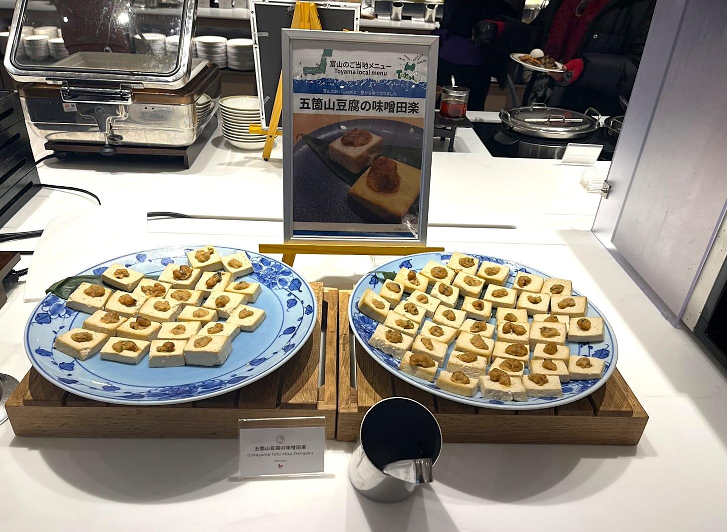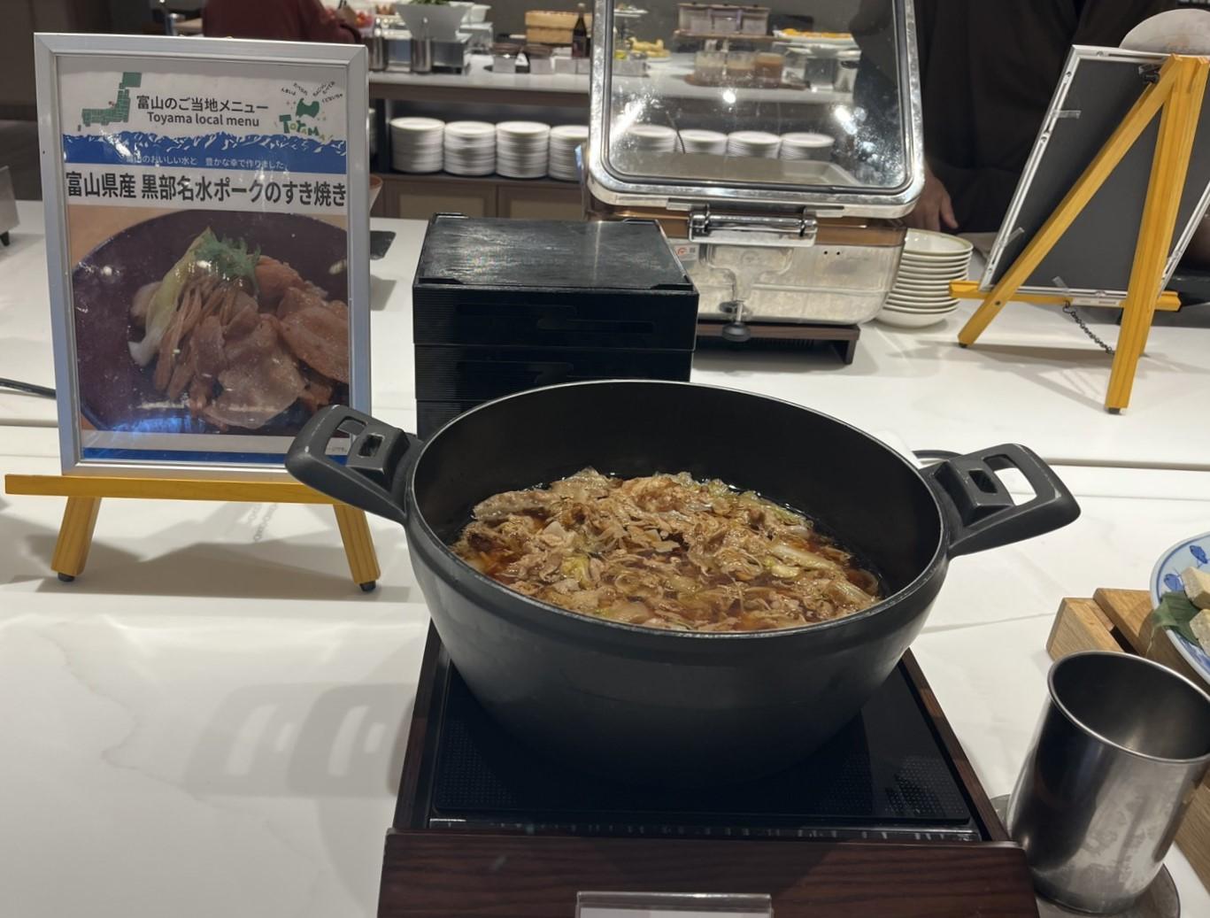 翌日の朝食は、会場に入場すると同時にカラフルなドーナツが目に入ってくる。スタンドに掛けられたドーナツが朝の華やかな雰囲気作りに一役買っており、いざなわれるように何個か取ってしまった。朝食にも五箇山豆腐や黒部名水ポークのすき焼き、富山おでんなどの地元メニューが用意されている。