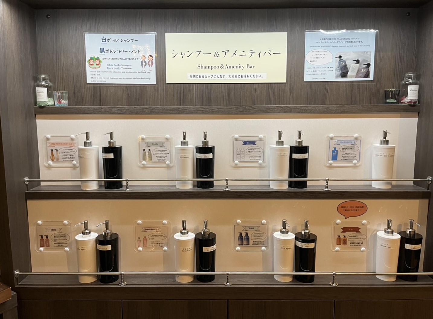 部屋を出て大浴場へ向かう。大浴場は宿泊者専用で、入り口前には「シャンプー&アメニティバー」コーナーがあり、有名ブランドのシャンプーやコンディショナーなどが並び、専用容器に入れて風呂場で利用できる。化粧水や乳液も揃えてあり、女性客に好評だという。