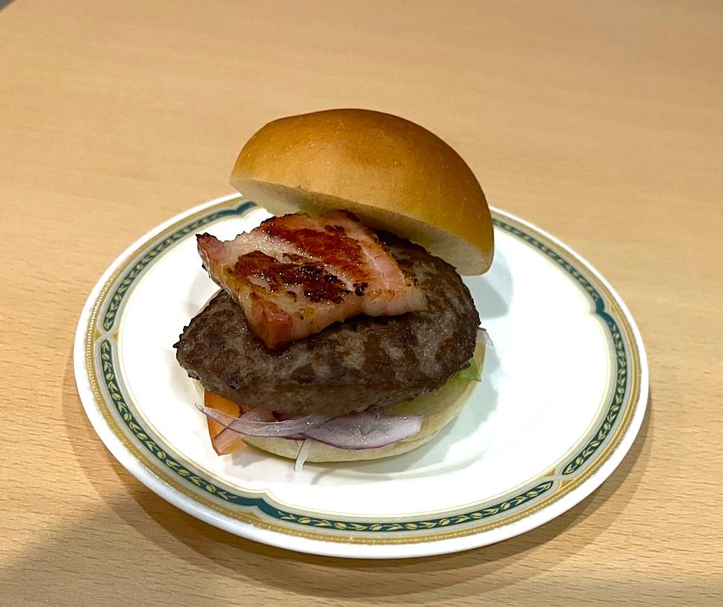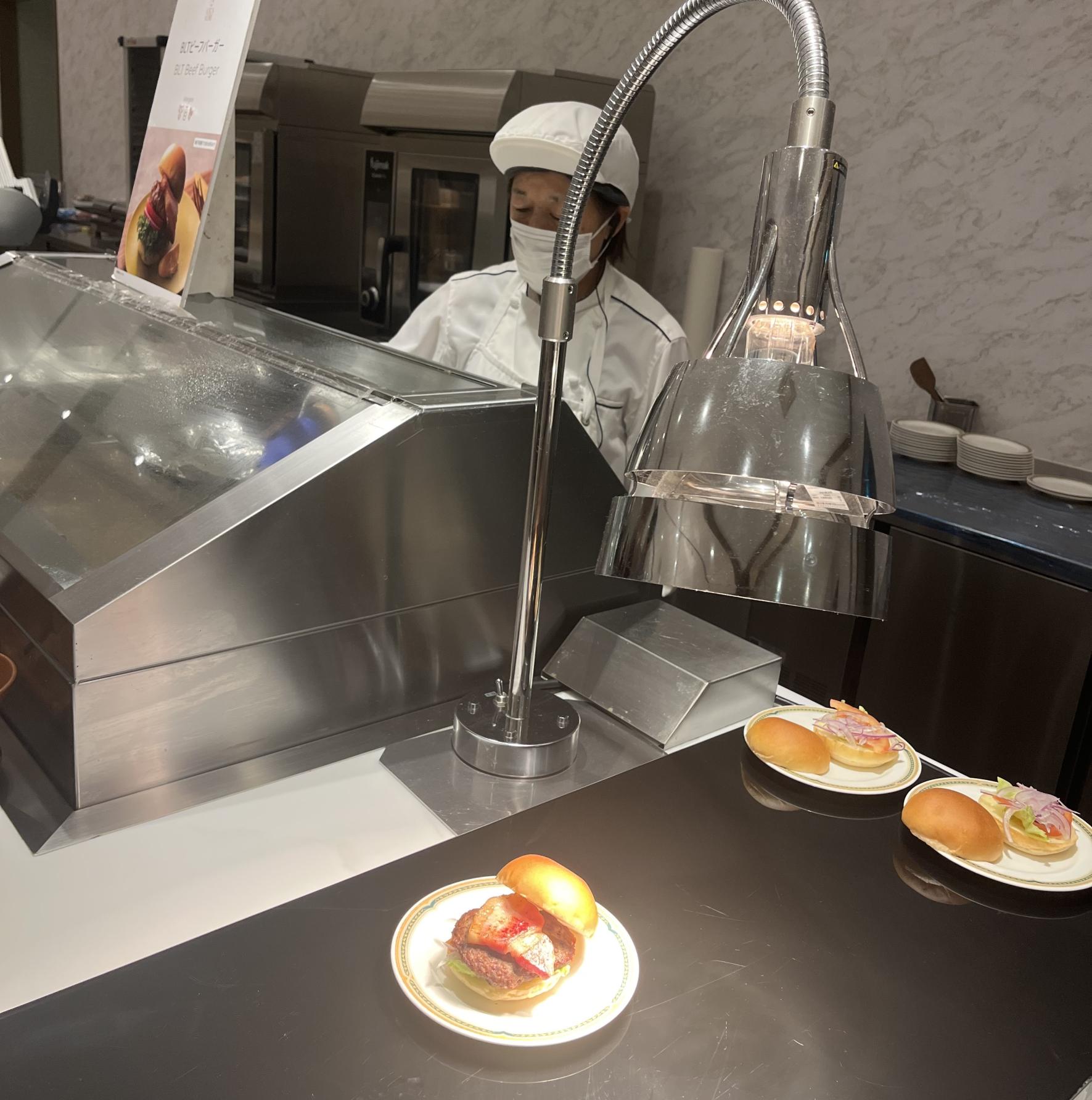 夕食の人気メニューの一つが、目の前で調理するハンバーガー。かぶりつくと、肉厚ベーコンとハンバーグの肉汁がぶわっと溢れ、それを柔らかなバンズが包み込む。思わず笑顔がこぼれてしまう幸せな味わいだ。