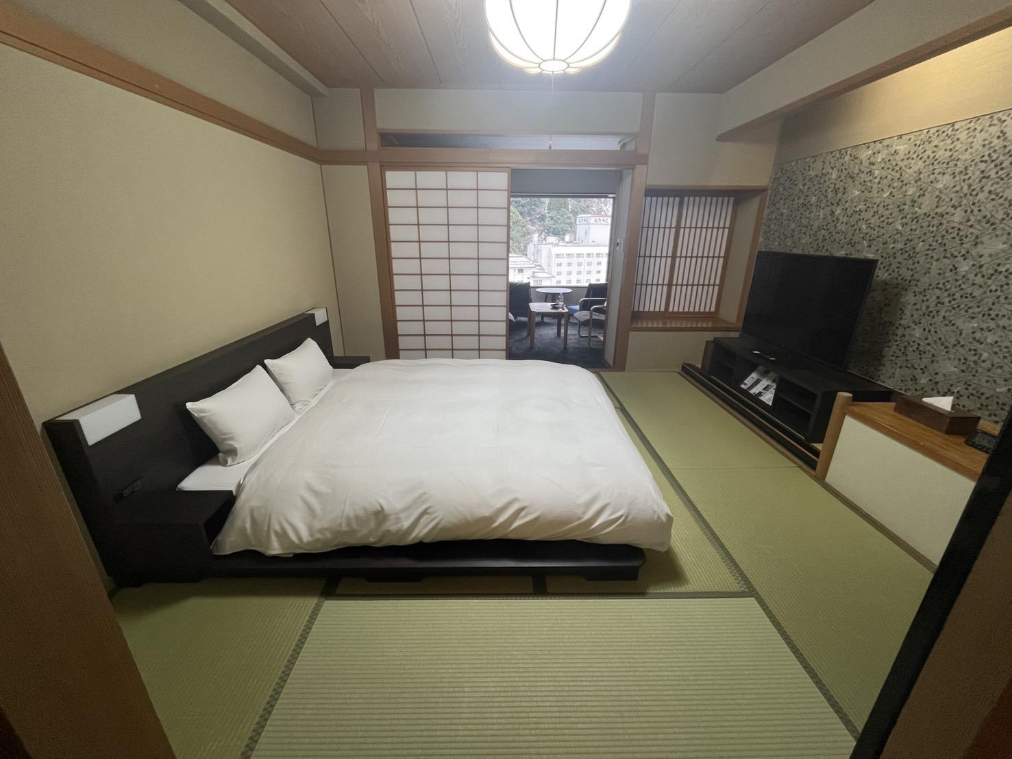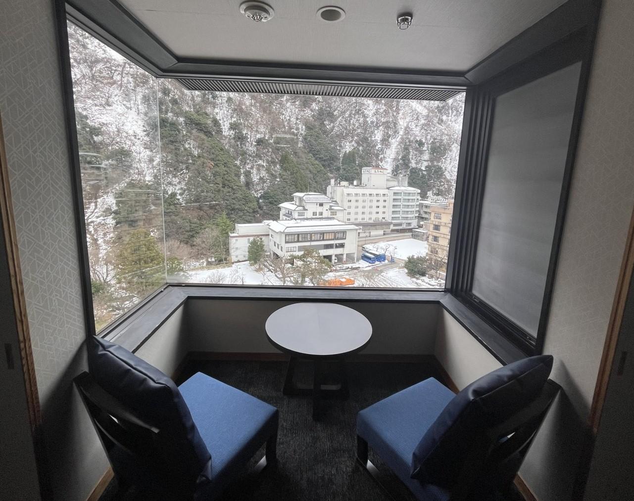 部屋は和室にベッドが設置された2名から4名利用のタイプが中心。ほか6名まで利用可能なデラックスルームが家族連れに人気だ。部屋奥の広縁(ひろえん)にはイスとテーブルが外向けに設置され、宇奈月温泉の山あいや黒部峡谷の風景をじっくりと眺めながらくつろげる。