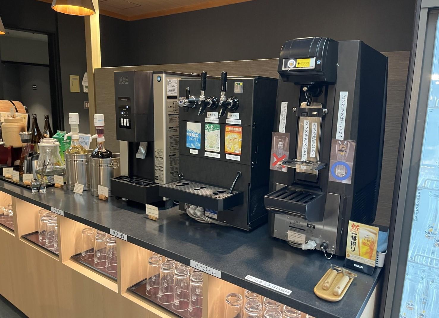 夕食はアルコールも楽しめる。ビール、酎ハイ、ハイボールといった定番はサーバーがあり、スイッチひとつで出来上がる。このほか地酒の日本酒、焼酎やワイン、ジンまで一通り揃う。