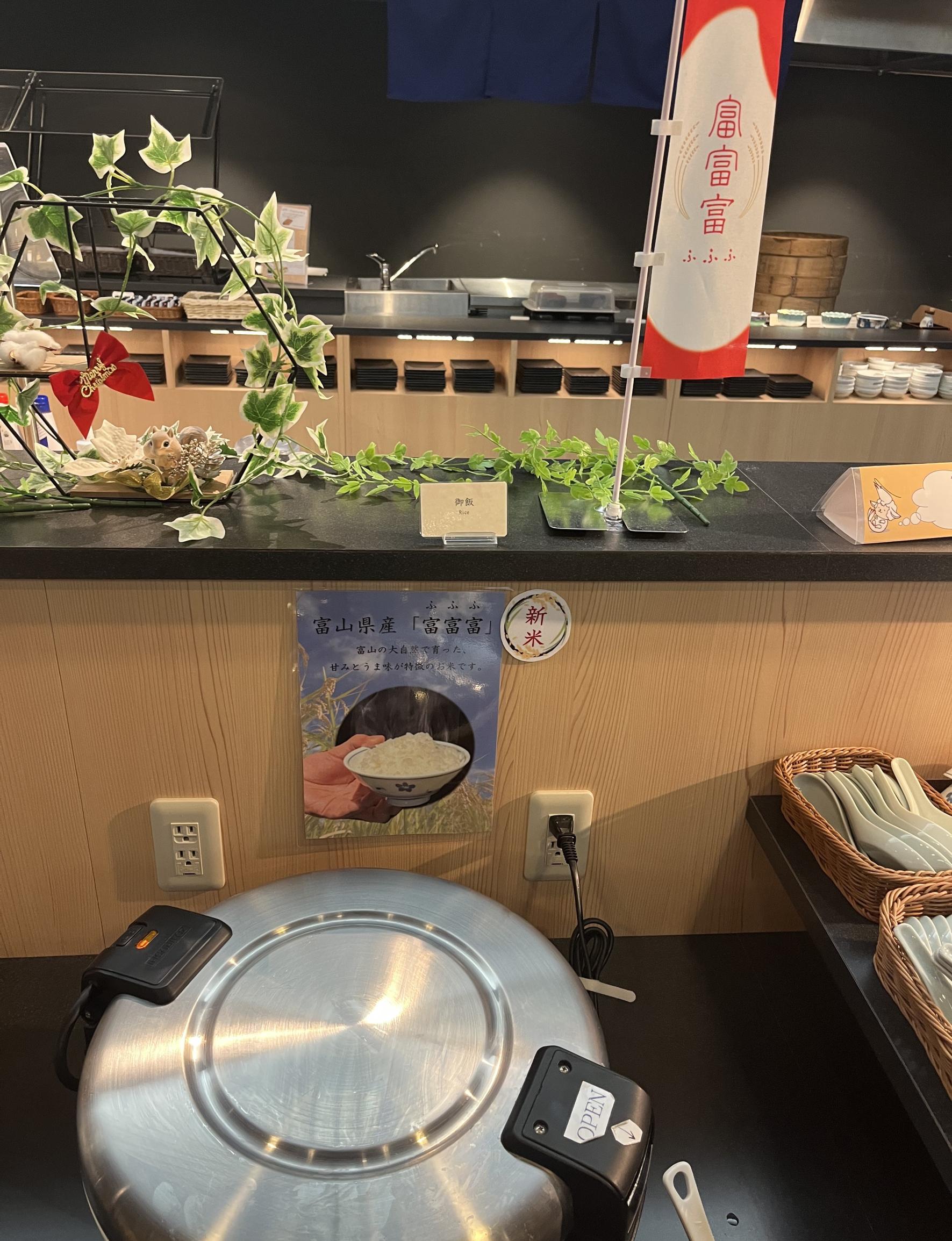朝食はビュッフェとなる。黒部市の生地蒲鉾やブリの塩焼き、自家製豆腐などが提供されていた。ご飯は富山県産米の「富富富(ふふふ)」を使用しており、筆者は皿いっぱいに盛り付けたおかずとともに、温泉宿での朝食マイルールである“おかわり三膳”を余すことなく実践した。