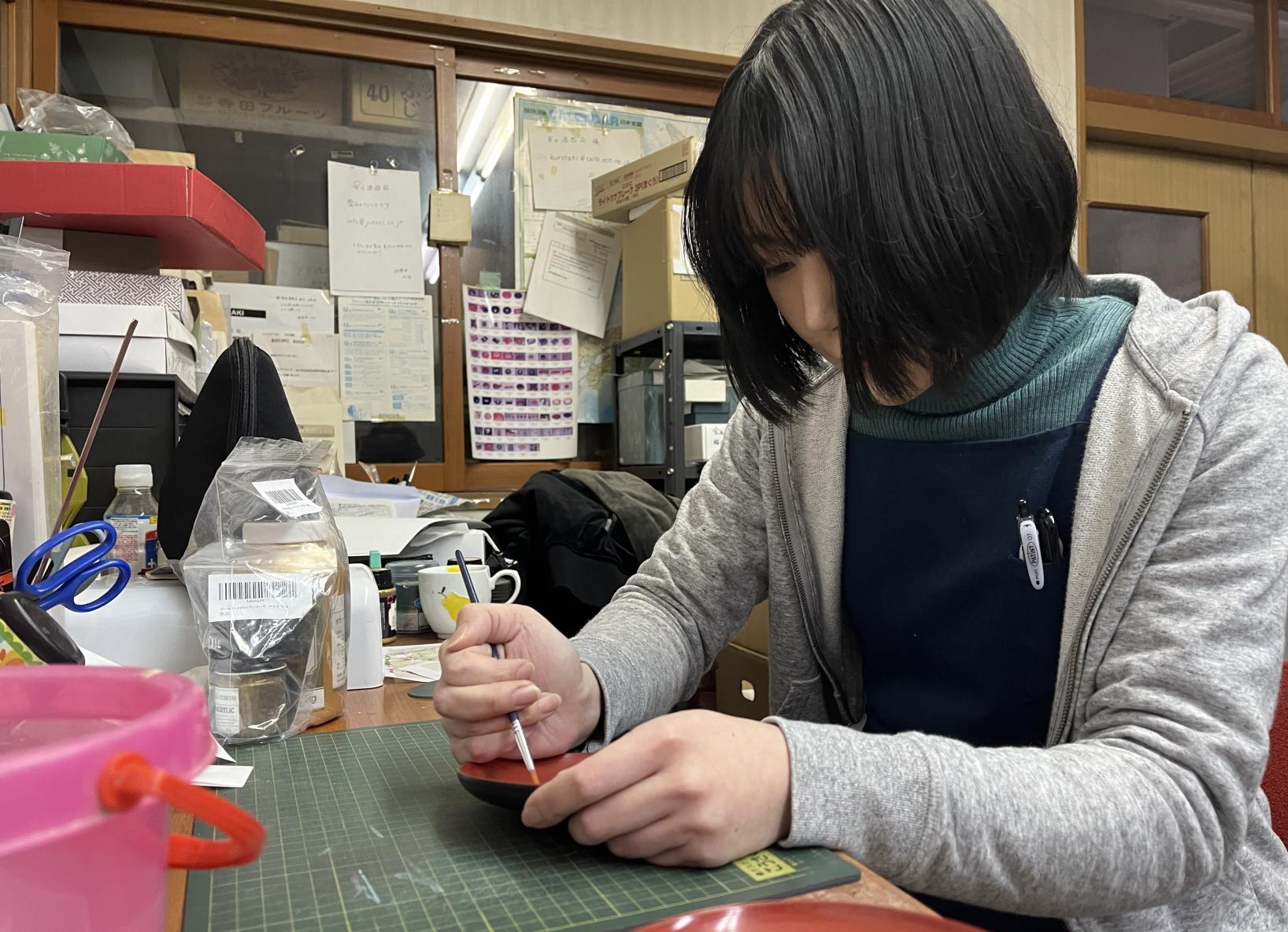 こう話すのは、高岡市の柴田漆器店で働く上原千紘さん。兵庫県丹波市に生まれ、昔から絵を描くのが好きだった。学生時代は美術部に所属。芸術系大学の進学を機に富山県へ移り住み、そこでも絵画の勉強に励む日々を送る。卒業後、学生時代の学びを活かす仕事をしたいと柴田漆器店の門を叩き、漆器職人に従事するようになって6年を数える。