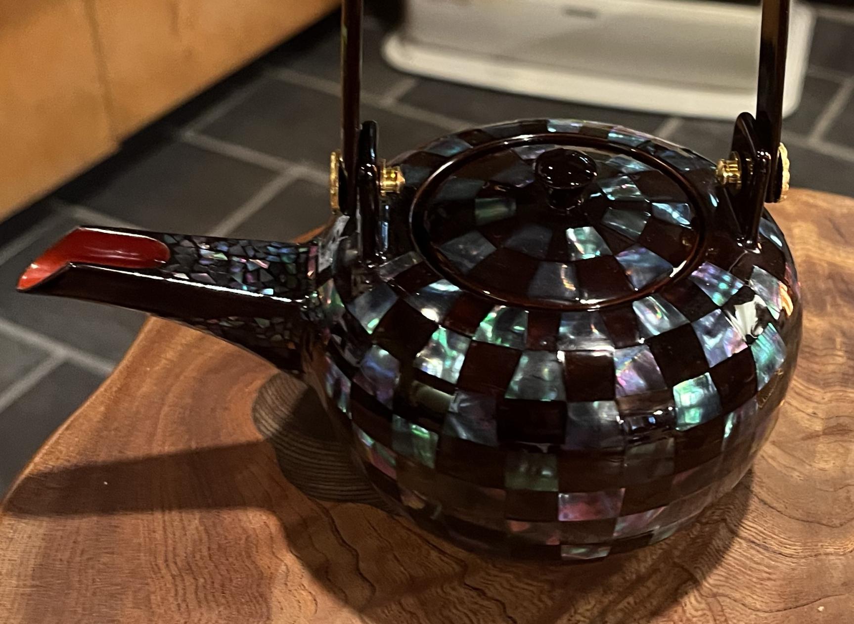 上原さんの作品からは、現代的で洗練されたデザインのものが目立つ。作品の一つである酒器の銚子(ちょうし)には、市松模様、いわゆるチェック柄が青貝で装飾されており、チェッカーフラッグ柄好きな筆者も、その美しさに思わず目を奪われた。