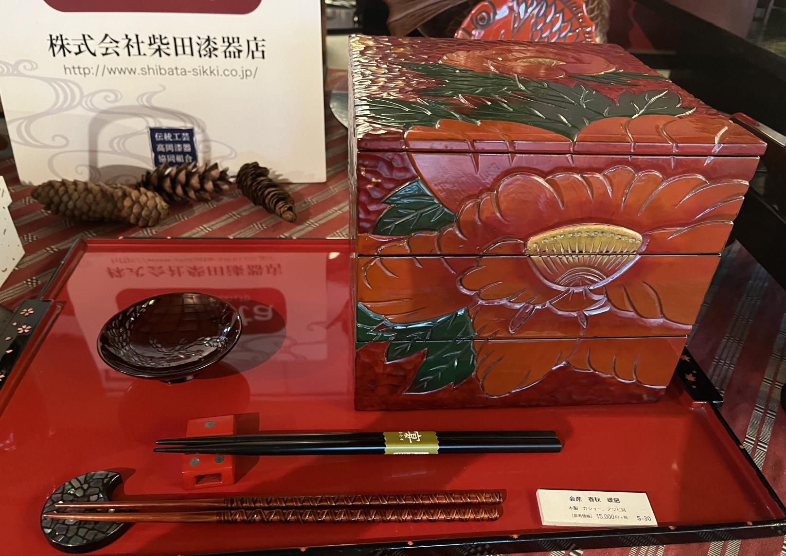 江戸時代の初め、加賀藩の藩主前田利長が高岡市に高岡城を築いたとき、武具や膳などの日常品を作らせたのが始まりとされる。「彫刻塗(ちょうこくぬり)」や「青貝塗(あおがいぬり)」などと呼ばれる多様な装飾技術で作られる。高岡の祭で使われる御車山(みくるまやま)には高岡漆器の技が集められ、豪華絢爛(ごうかけんらん)な様子が観覧者を楽しませている。
