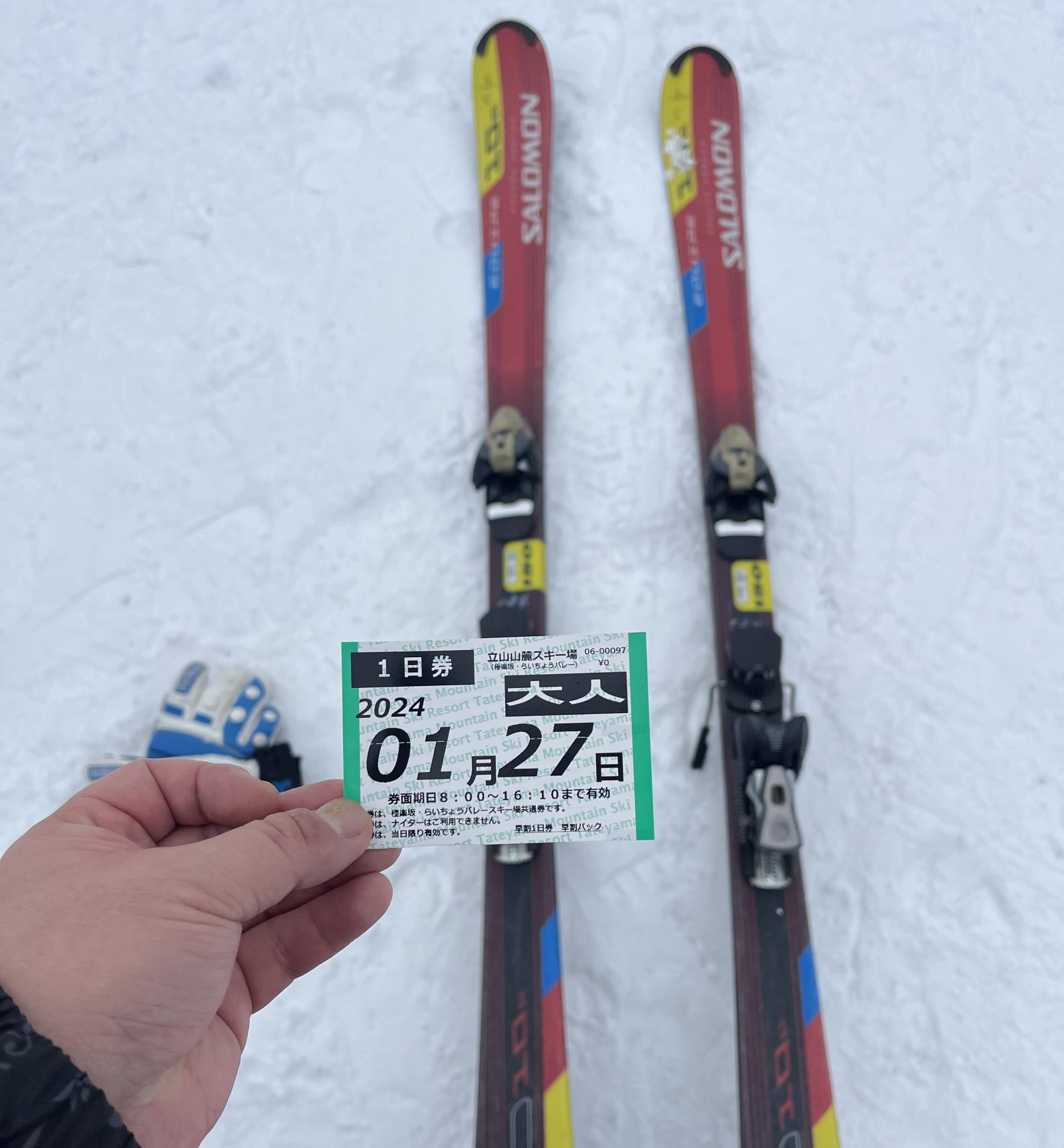立山山麓スキー場は、極楽エリア(旧極楽坂スキー場)と雷鳥エリア(旧らいちょうバレースキー場)の2つのゲレンデがあり、今回は雷鳥エリアに向かった。到着すると、親子連れや若いカップル、学生グループなどでにぎわっているのが目に入る。積雪はばっちり、天気はくもりのち晴れの申し分ない状態だ。スキーもウェアも持たず、この身一つで来たので、「食堂ふじ」で一式を借りる。スキーかボードか迷ったが、より経験値のあるスキーを選んだ。