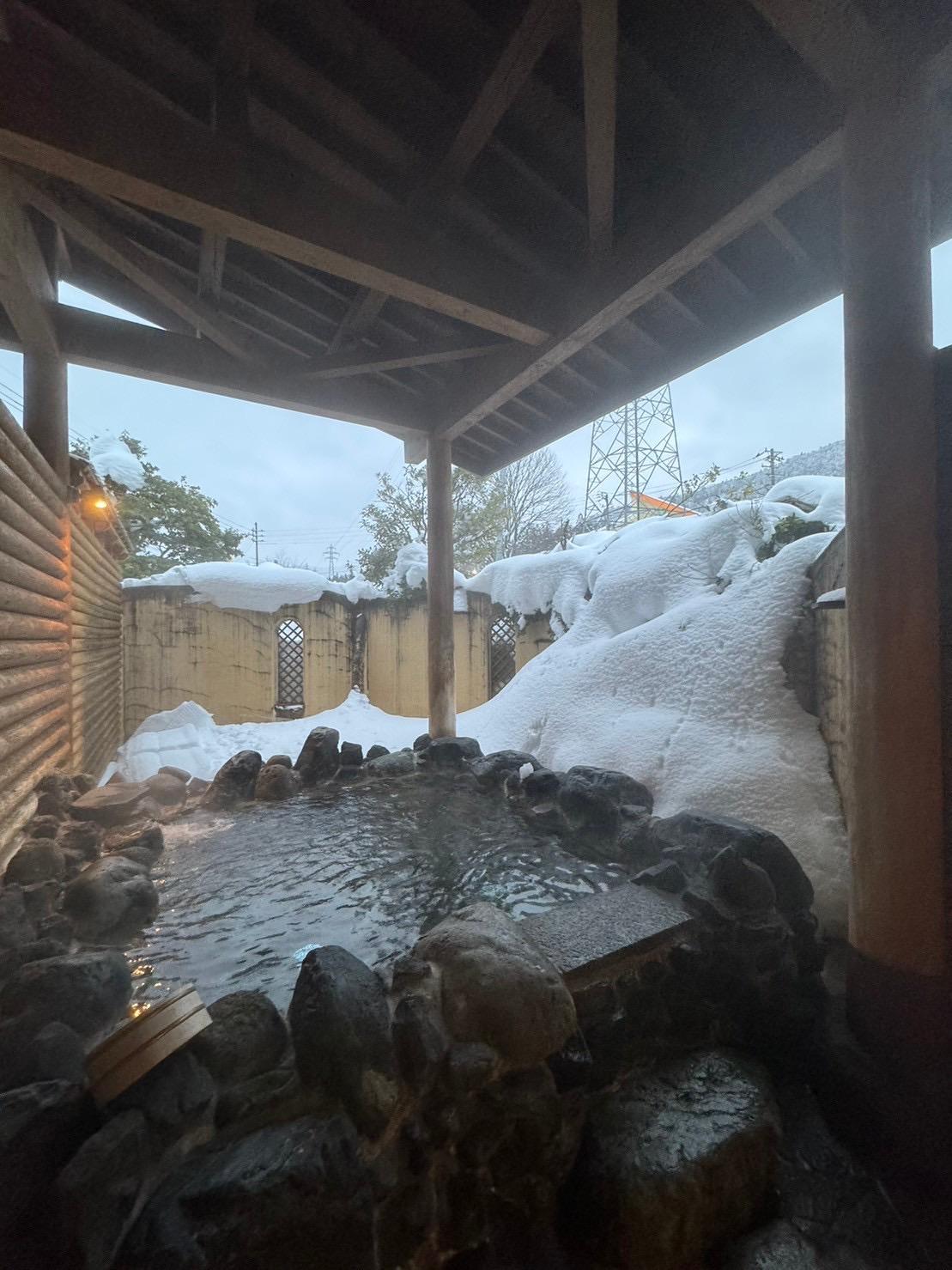 天然温泉はアルカリ泉で、宿泊客からは「肌がつるつるになった」と評判の美肌の湯。ヒノキの露天風呂の奥には、真っ白な雪が積もり重なり、情緒ある雰囲気を醸し出している。
