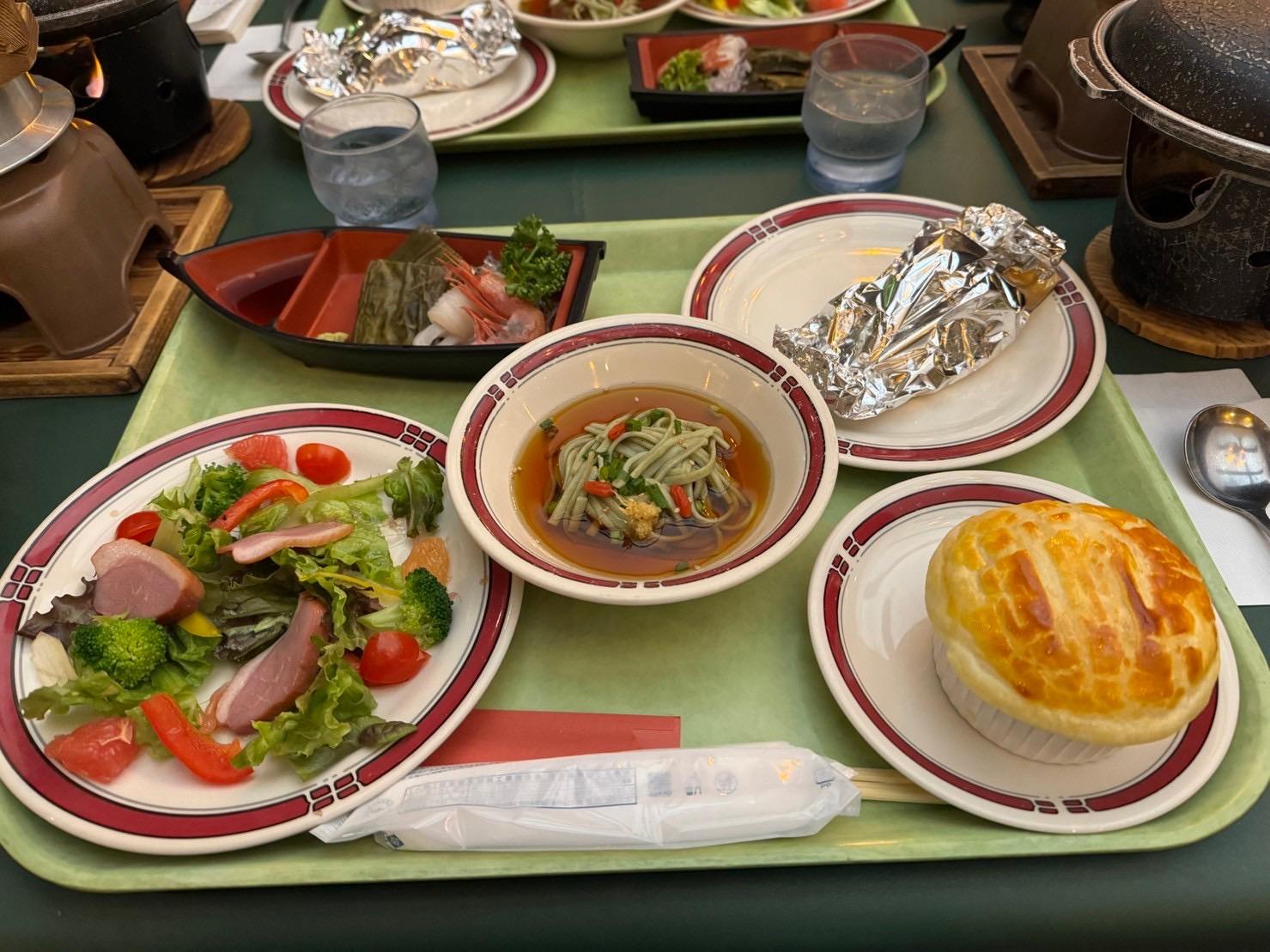 炊き立てほくほくの山菜釜めしとデザートの自家製キャラメルケーキも完食し、大満足の夕食を終えた。