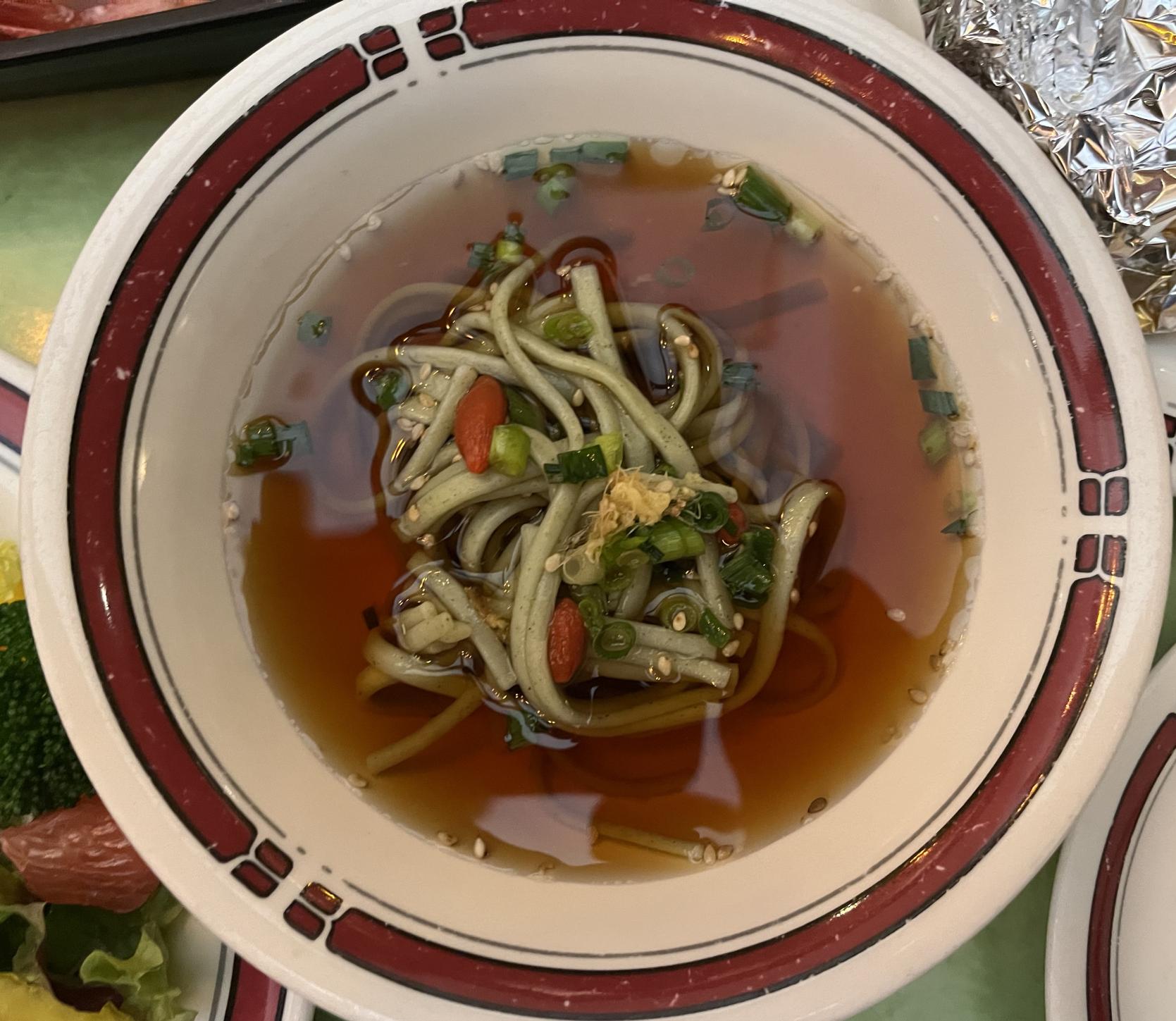中央に陣取るのは、地域特産のモロヘイヤを練りこんだ冷そば。茶そばのような独特の香味が面白く、つるりとしたのどこしも抜群だ。
