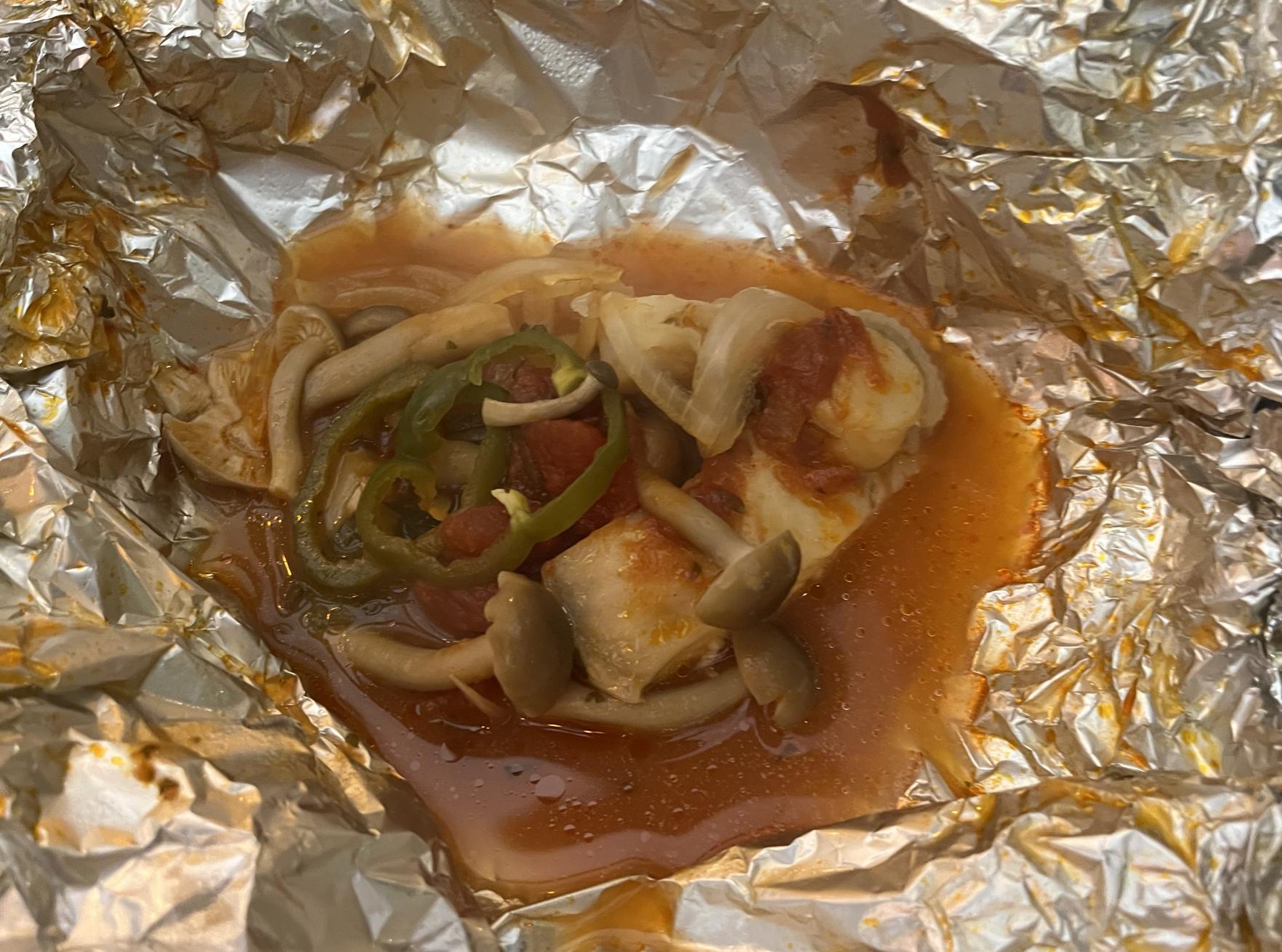 カレイのホイル蒸しはトマトが入った洋風の味付けで、甘酸っぱく濃厚で酒との相性も良い。