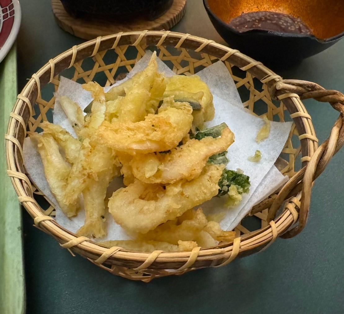 白エビのから揚げと山菜の天ぷらは、揚げたてをいただく。サクサクの口当たりと甘みが特徴の白エビはもちろんのこと、コゴミやウドといった山宿ならではの山菜はみずみずしく、コリコリシャクシャクした食感を楽しむ。