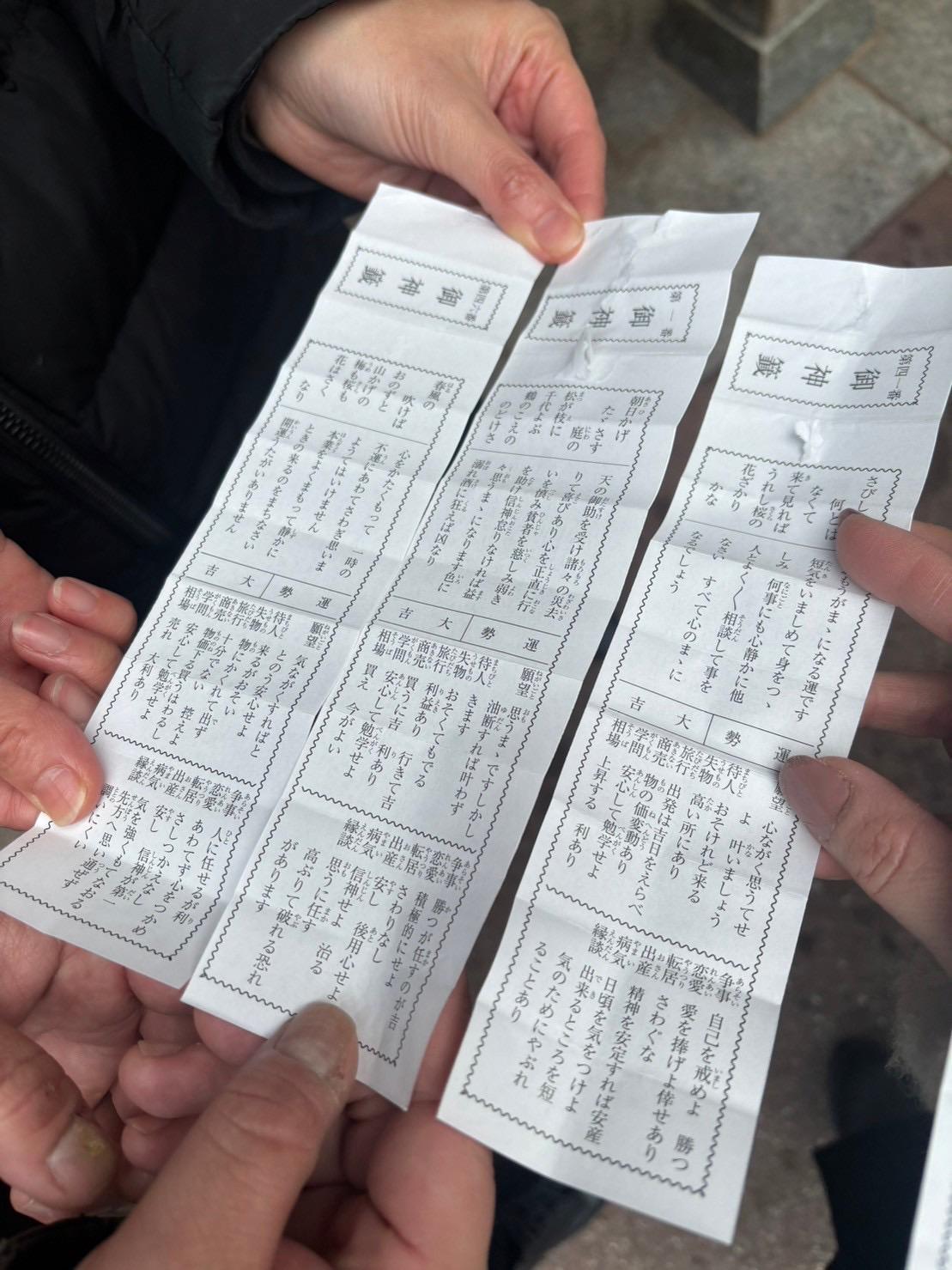 チェックアウト後、帰り道にある雄山神社前立社壇(おやまじんじゃまえだてしゃだん)で、遅ればせながらの初詣。参拝後に引いたおみくじは大吉。新年早々の大地震で心が落ち着かない日々であったが、これからは良い出来事があればいいな、と期待して帰路についたのであった。