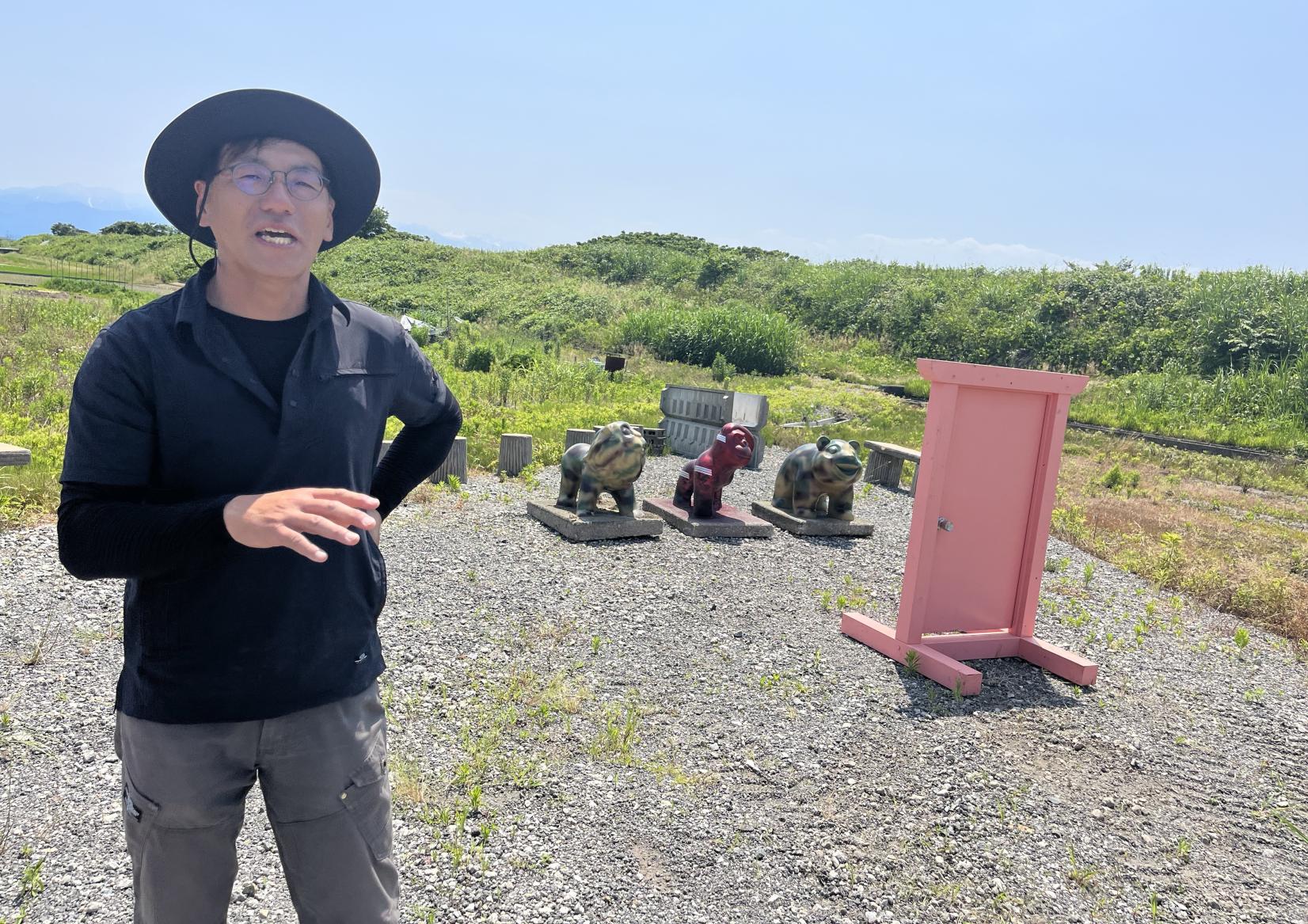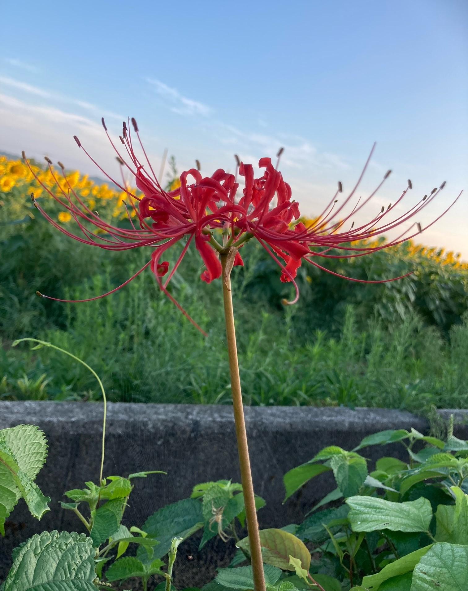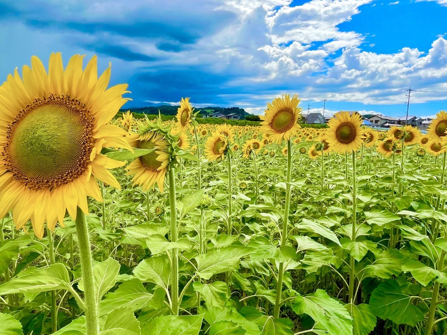 2023年、2年目のひまわり畑は、7月の豪雨で生育が阻まれて8月に満開とはならず、9月に開花した。遅咲きの分、畑の隅で咲いた彼岸花と相まって、鎮魂の情景を創り出した。2024年は予定通り8月上旬と中旬に2度の満開を迎え、連日大勢の観光客でにぎわった。