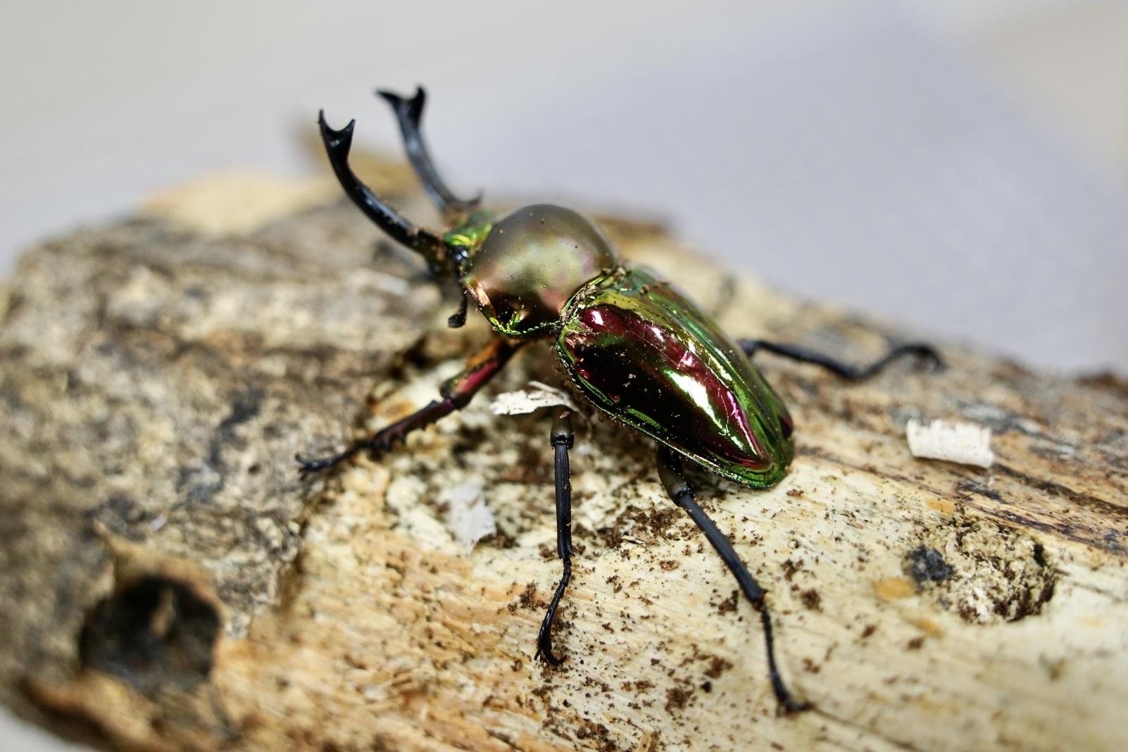 全国でも珍しい、世界の外来種を堪能できる展示コーナーはまさに圧巻。目玉はやはり、世界最大品種のヘラクレスオオカブト。王者の風格を放つ生きたヘラクレスは、大人が見てもワクワクすること間違いナシです。クワガタ派の皆さんもご心配なく、オセアニアの至宝ニジイロクワガタが展示中でした。カブトには無い鮮やかなツヤ、そしてメタリックなレインボーカラーが目を惹く一匹。スタッフにお願いすれば、ケージから出して間近に眺めることもできますよ。