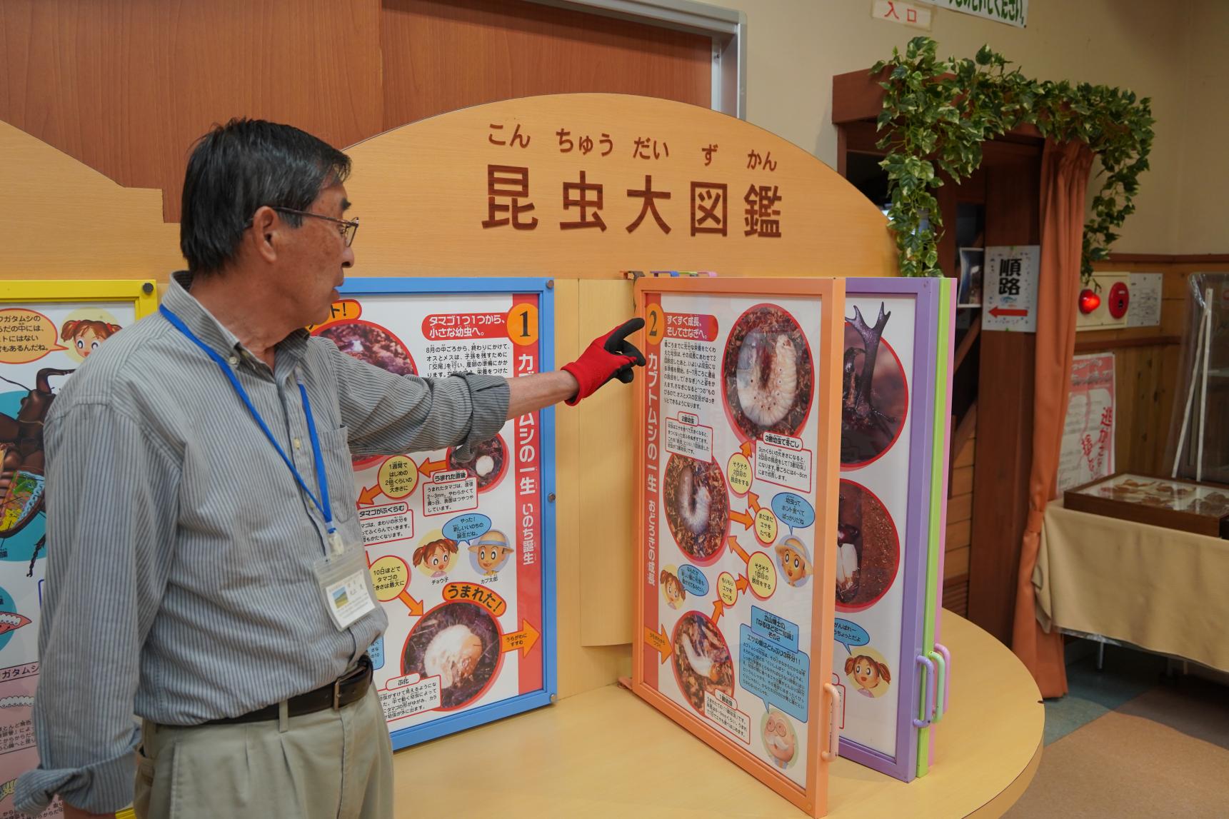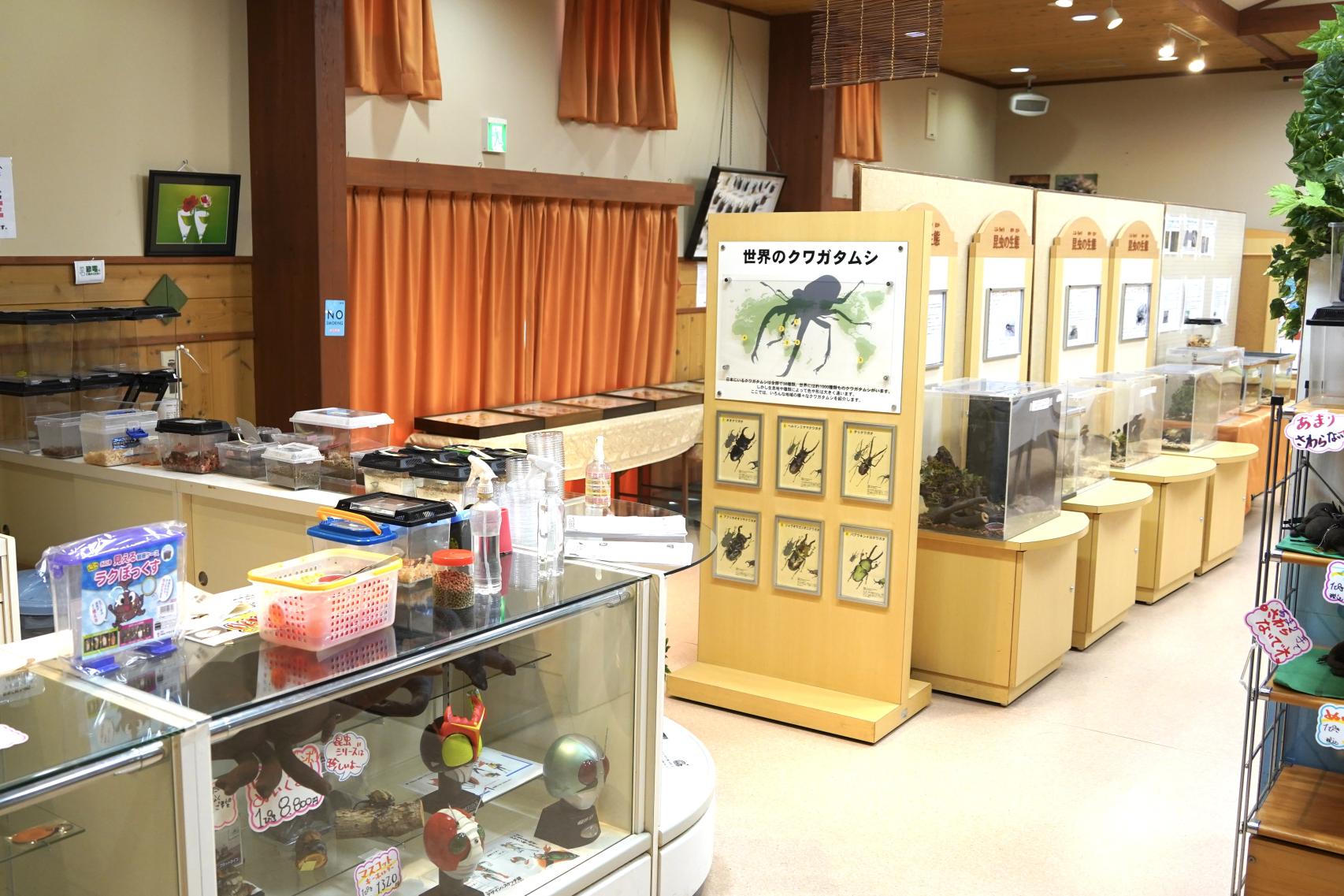 自然ふれあい館の最奥にある一室が「昆虫ドーム」。広々とした空間に100匹以上のカブトムシやクワガタが放し飼いにされ、もちろん手に乗せてもOK!さらに、気に入った成虫はその場で購入まで可能、まさに見本市!館内で飼育キット一式も買えるので、手ぶらで来てもOK。シーズン中はいつ子ども達が来ても楽しめるよう、数千匹ものカブトムシを幼虫から育てて用意しています。ここまで大量飼育が実現できている施設は、全国でも珍しいそうです。