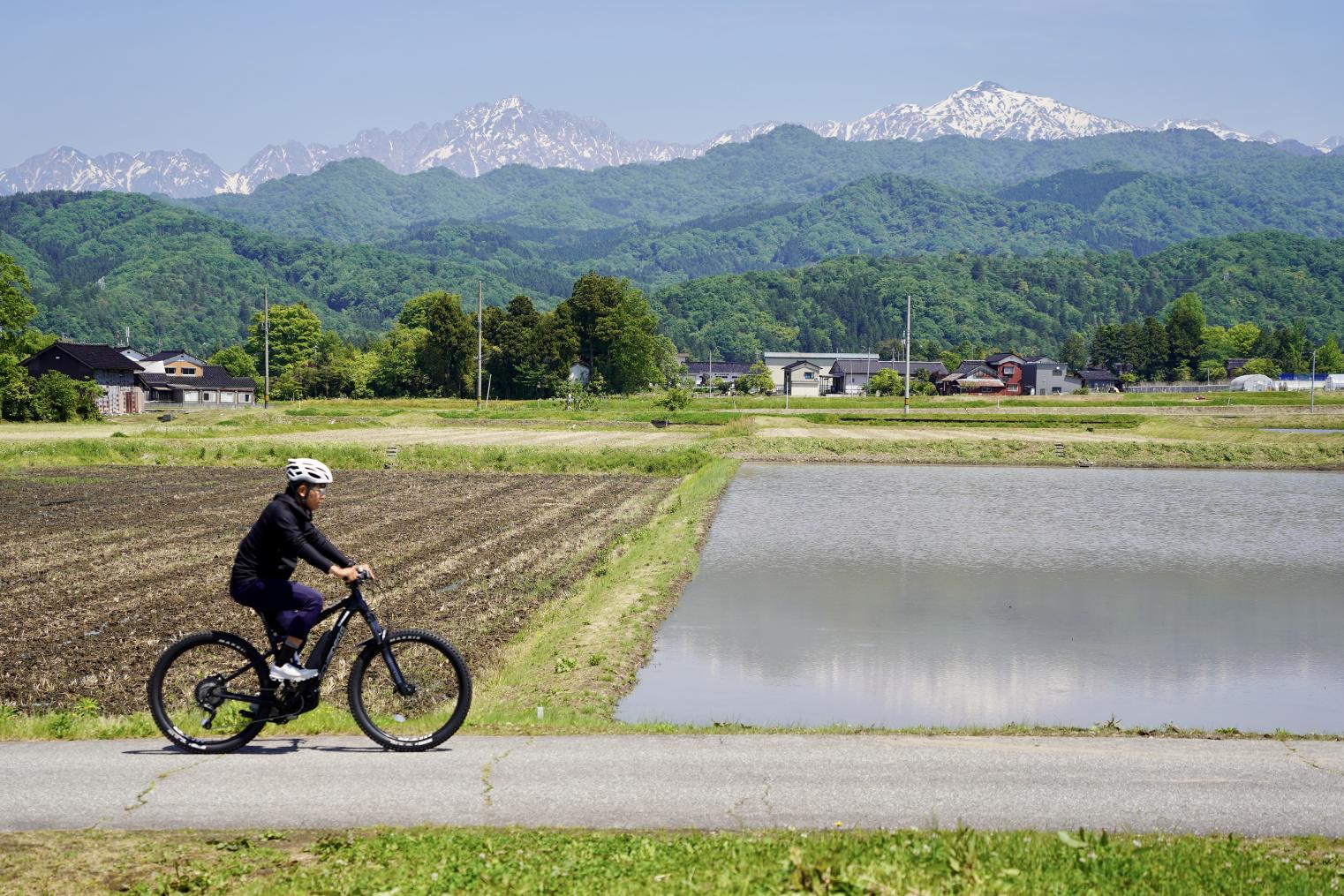 車が無くてバス利用もやや面倒、という方にはレンタサイクルがおすすめ。今回は五百石駅前の「立山町観光協会」からEバイクをレンタルしました。距離5km、走行時間20分であっという間に到着。道中は田植え中の緑鮮やかな町並み、そして立山連峰が見応えバッチリなプチサイクリングを楽しめます。レンタサイクルは以下から予約できますよ。