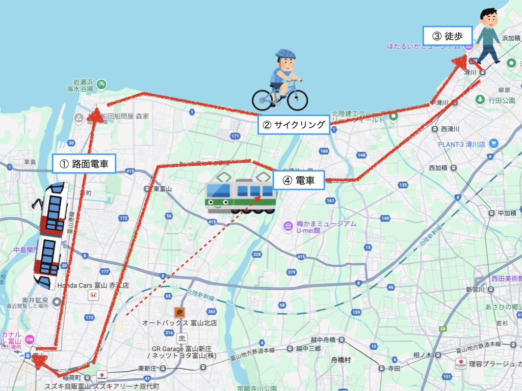 今回は、路面電車→サイクリング→徒歩→電車をミックスした観光コースを企画しました。