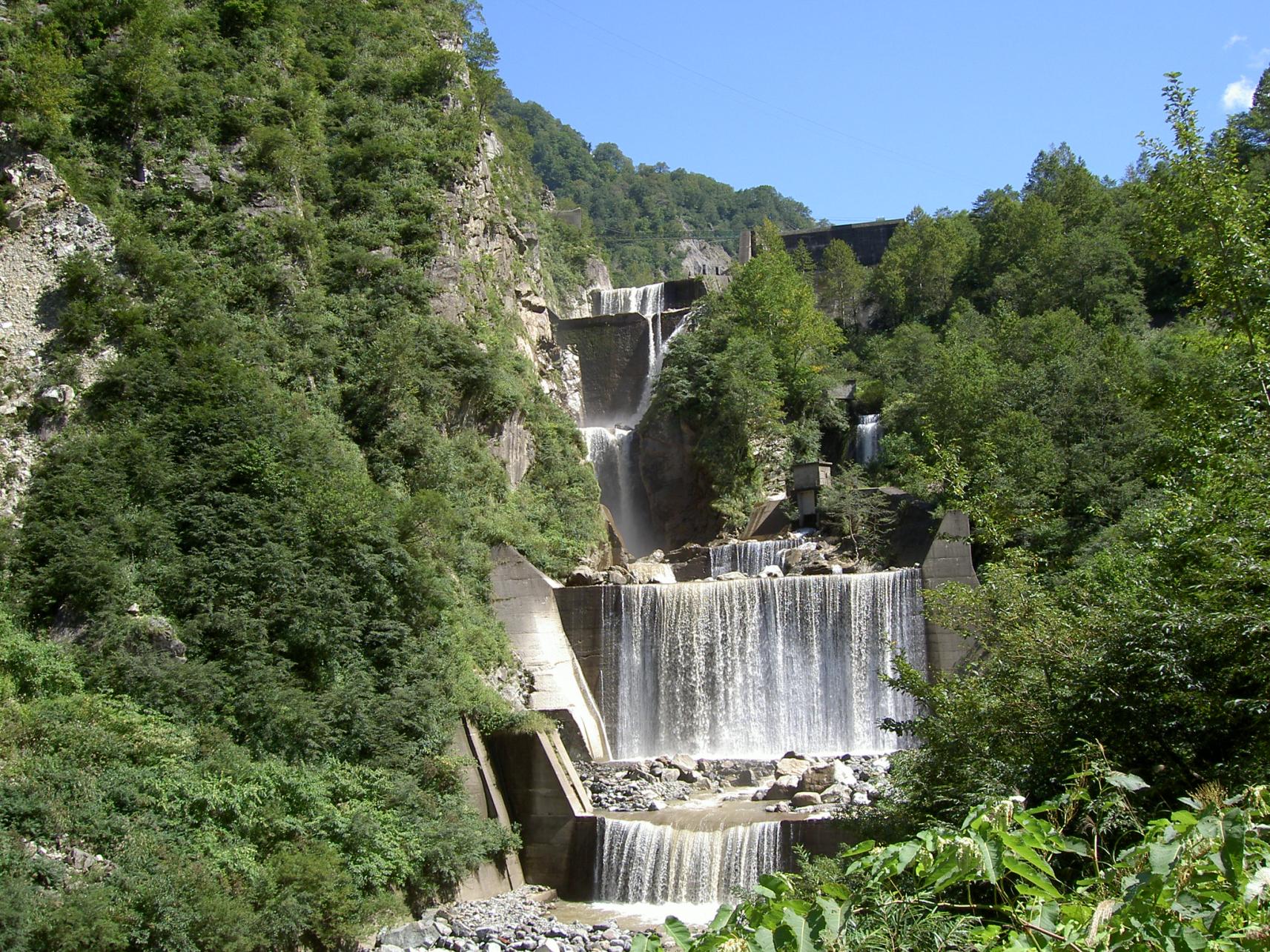 白岩堰堤(しらいわえんてい)は本堰堤の高さ63m、7基の副堰堤をあわせると落差108mを誇る巨大な砂防設備。