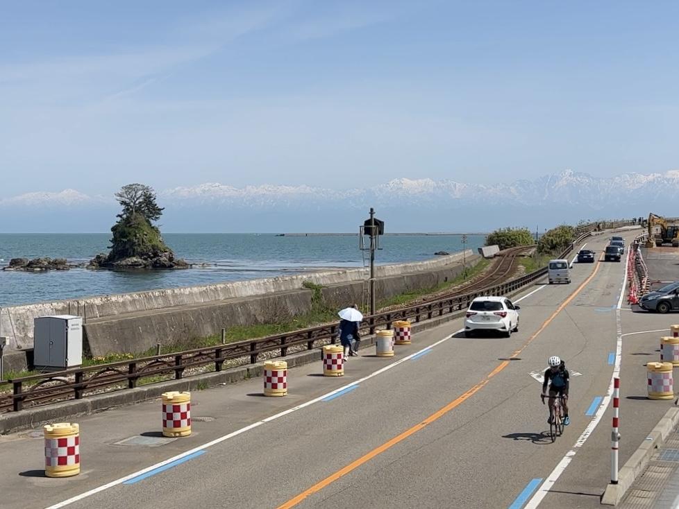 島尾海岸と立山連峰をバックに、快適にサイクリングを楽しめます。