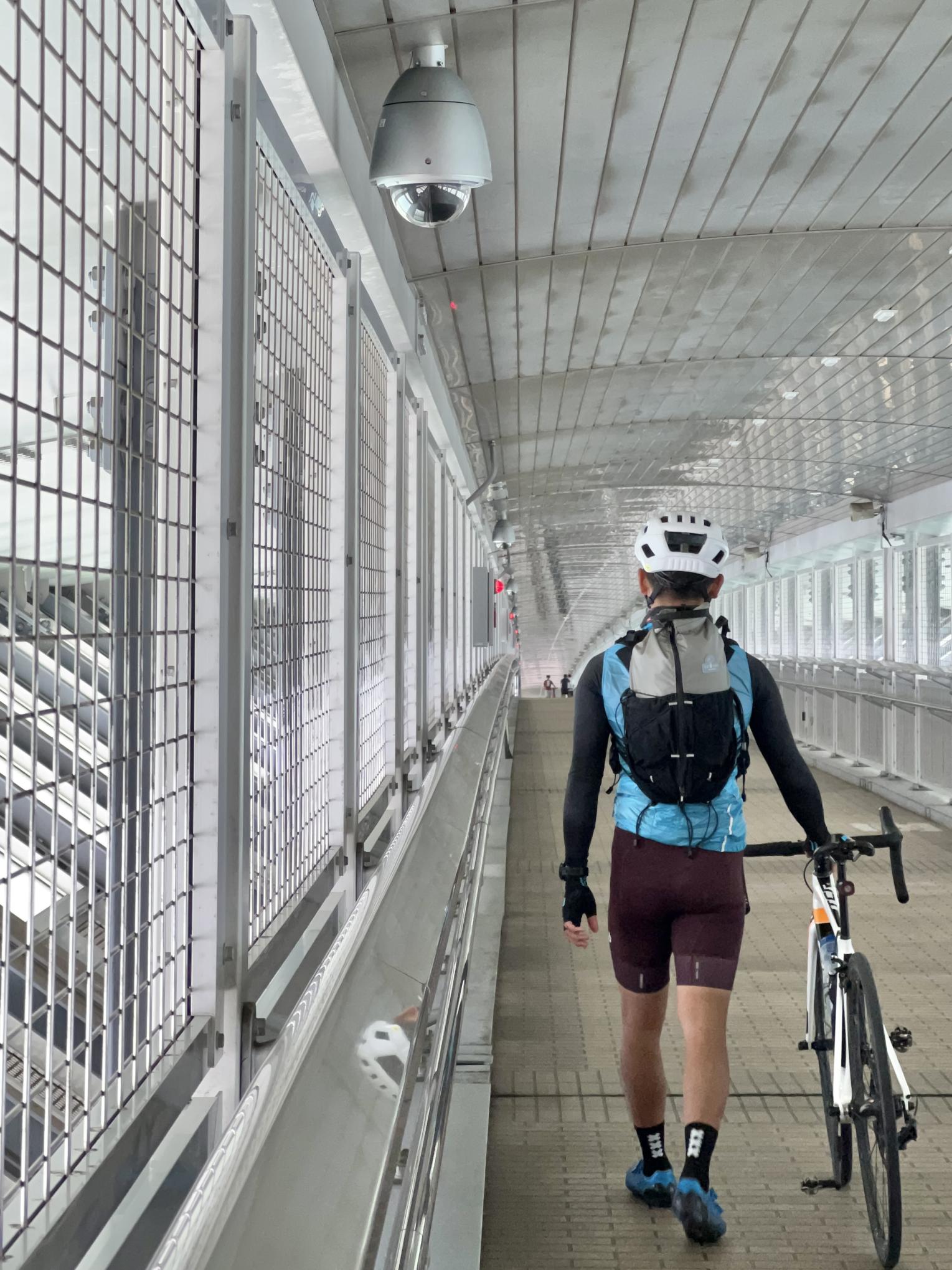 橋は乗車しては渡れないので、歩行者通路を押し歩きして対岸に渡ります。