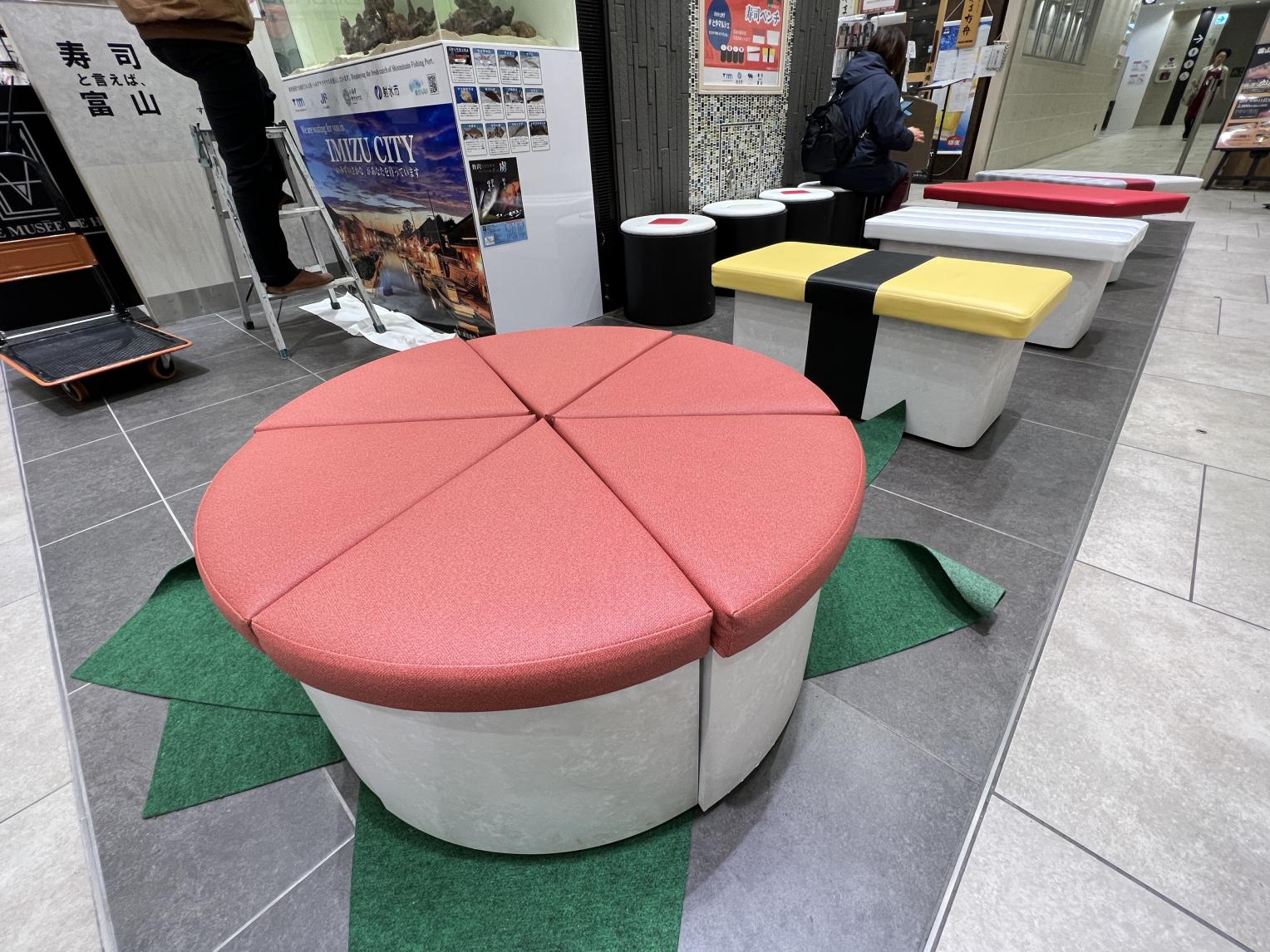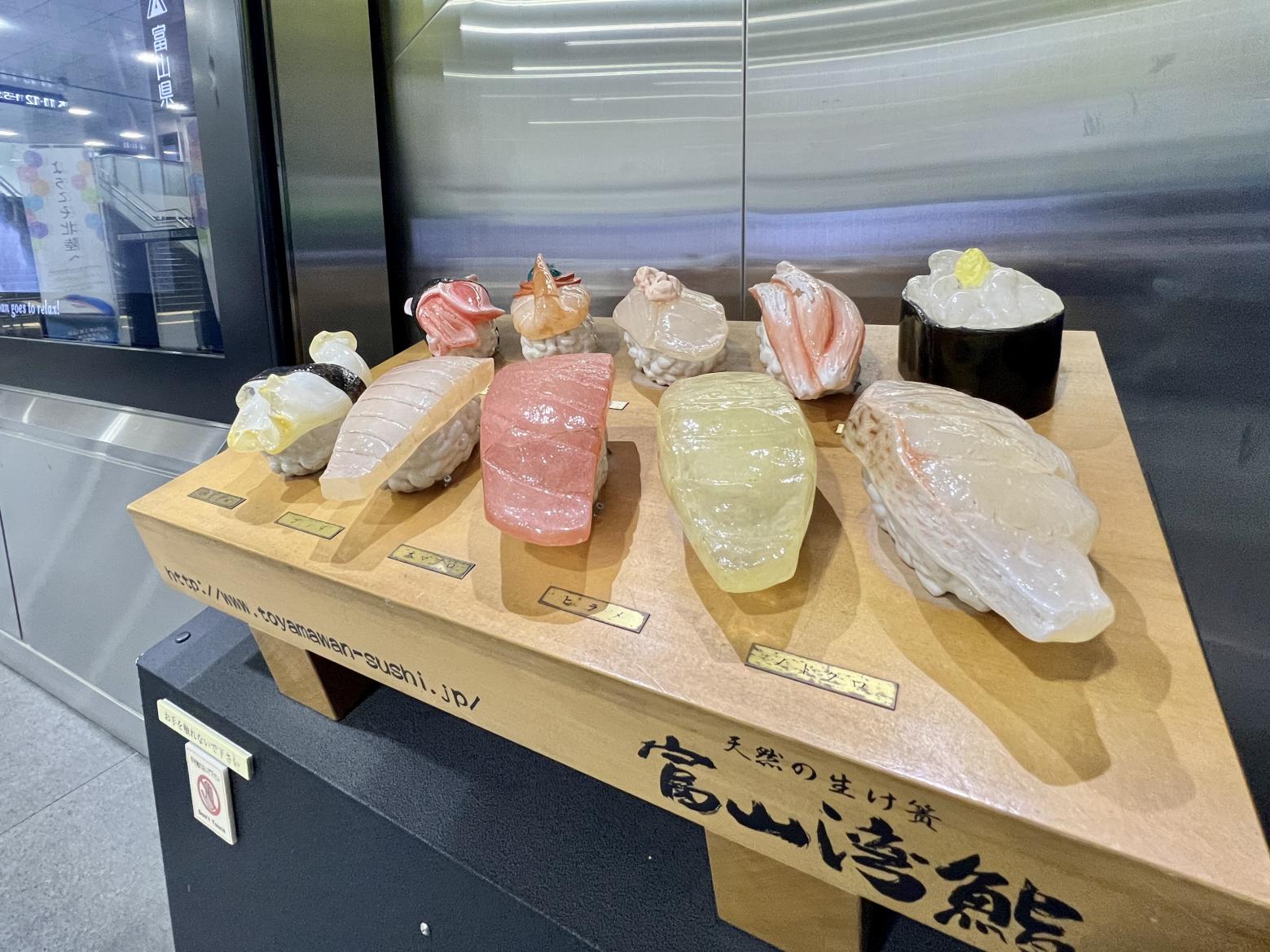 駅構内には富山湾鮨の巨大オブジェがあり、寿司にまつわるモチーフが遊び心たっぷり。