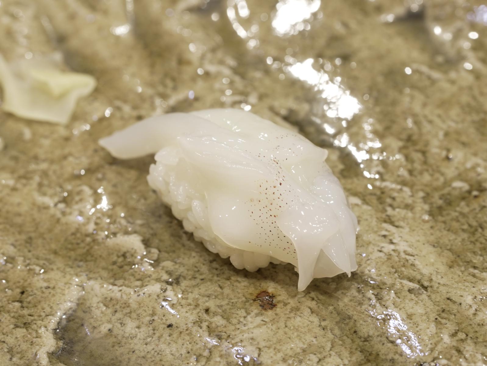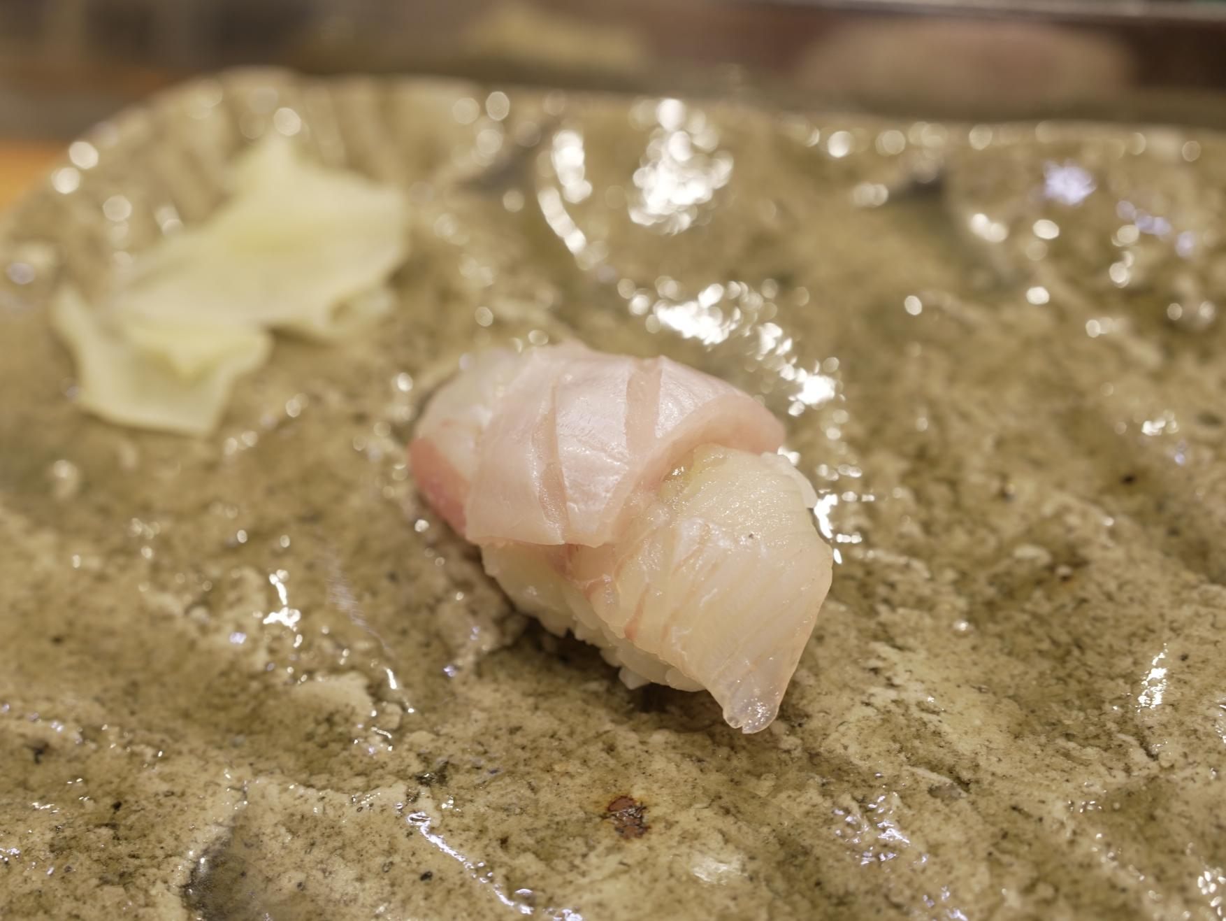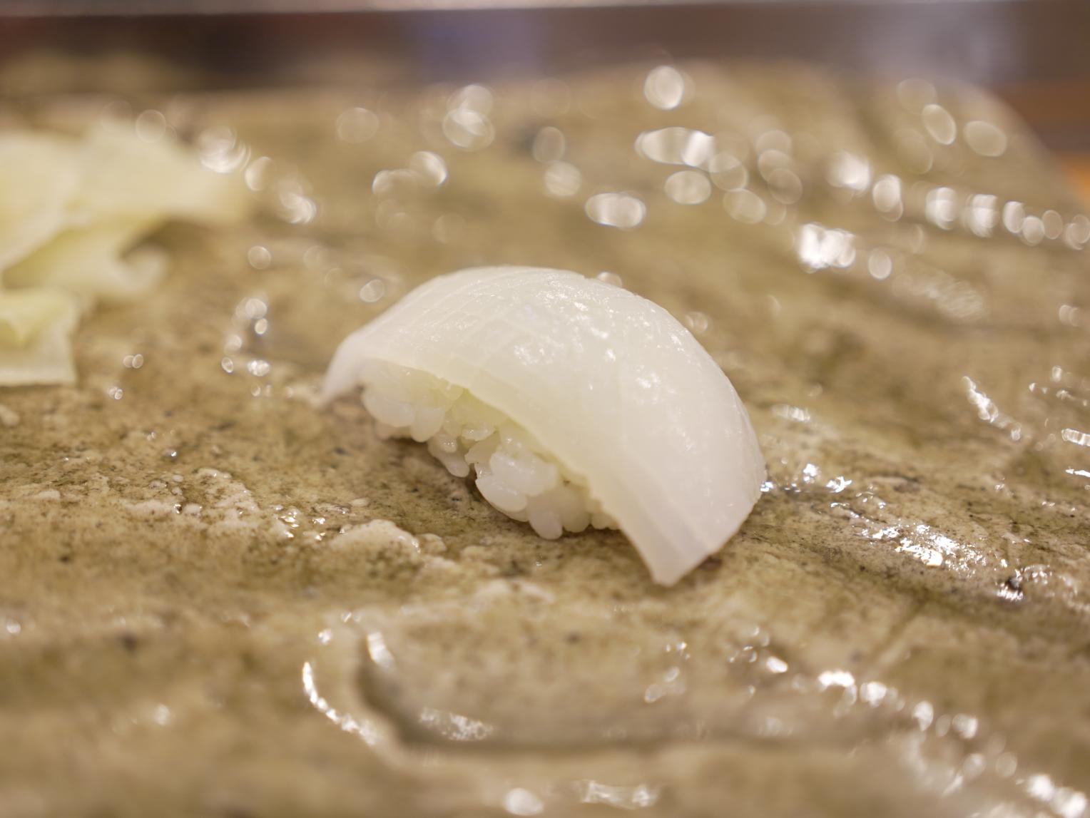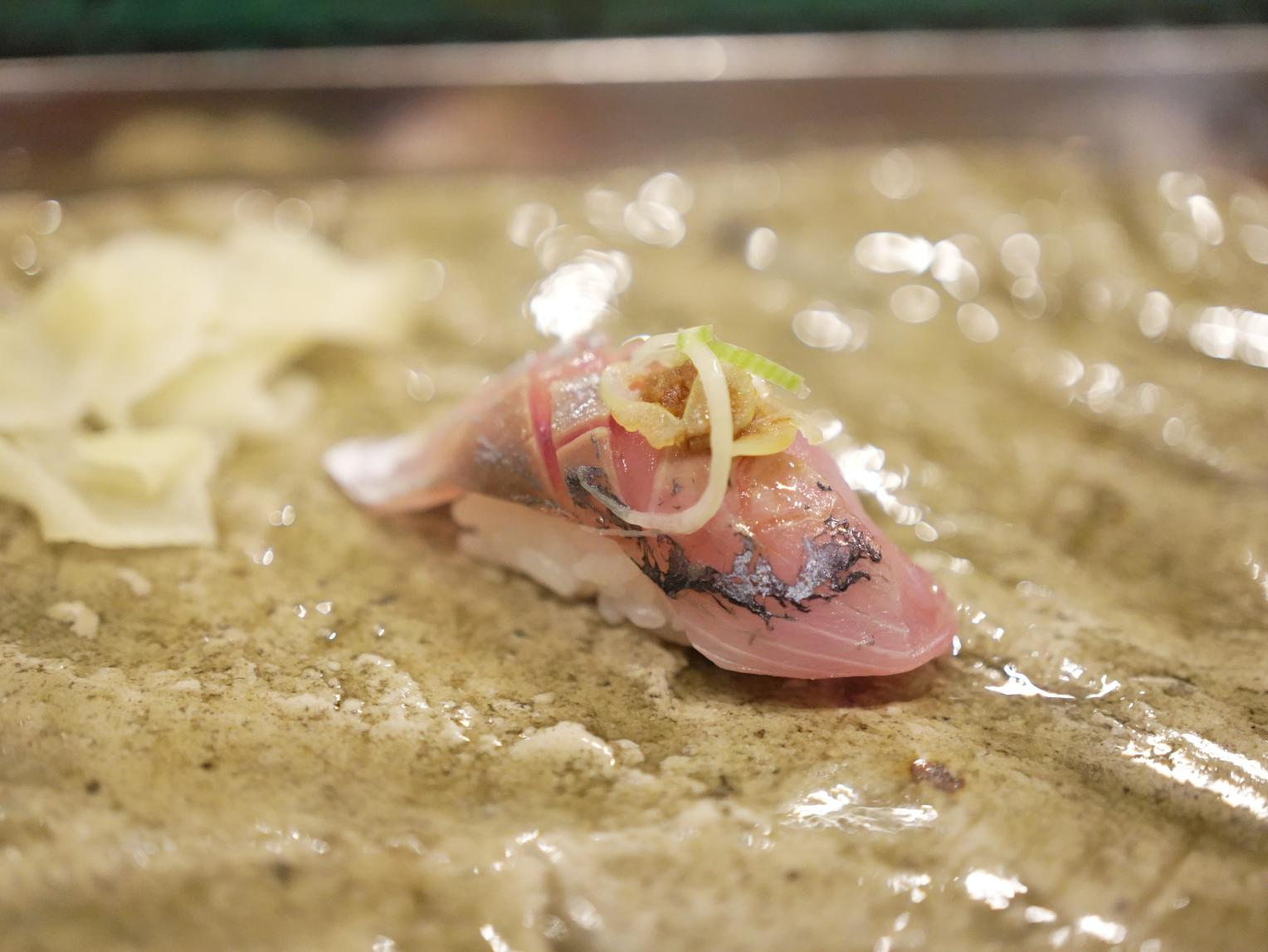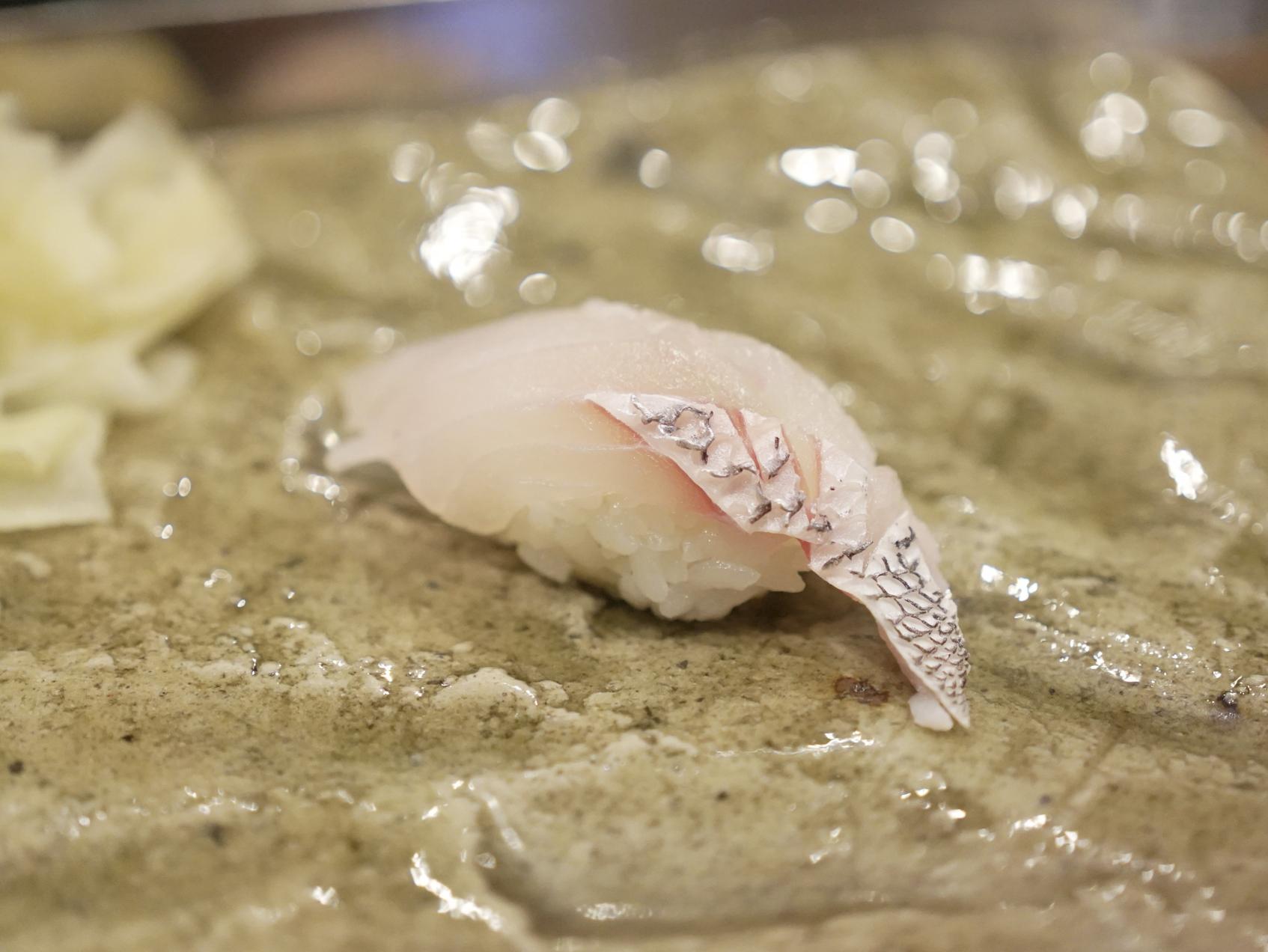 カウンター席では一貫づつ提供となり、板橋さんの職人技を見ながらじっくりといただきます。さらに、盛り皿は立山町の工芸品「越中瀬戸焼」を用いるこだわりっぷり。一貫ずつ味わうのもオツなものです。