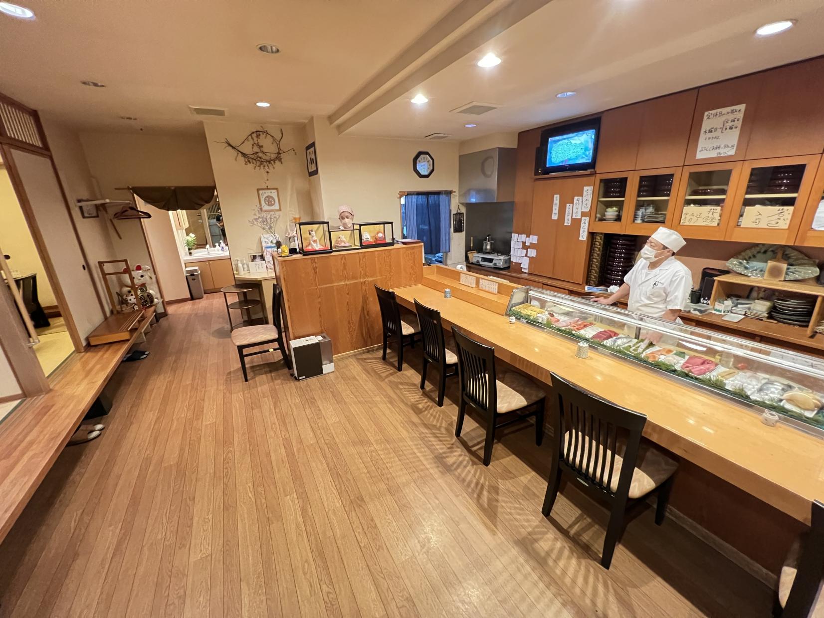 計18席(カウンター6席、テーブル12席)のコンパクトな店内で、落ち着いた雰囲気でお寿司を堪能できます。定休日は水曜日+不定休。