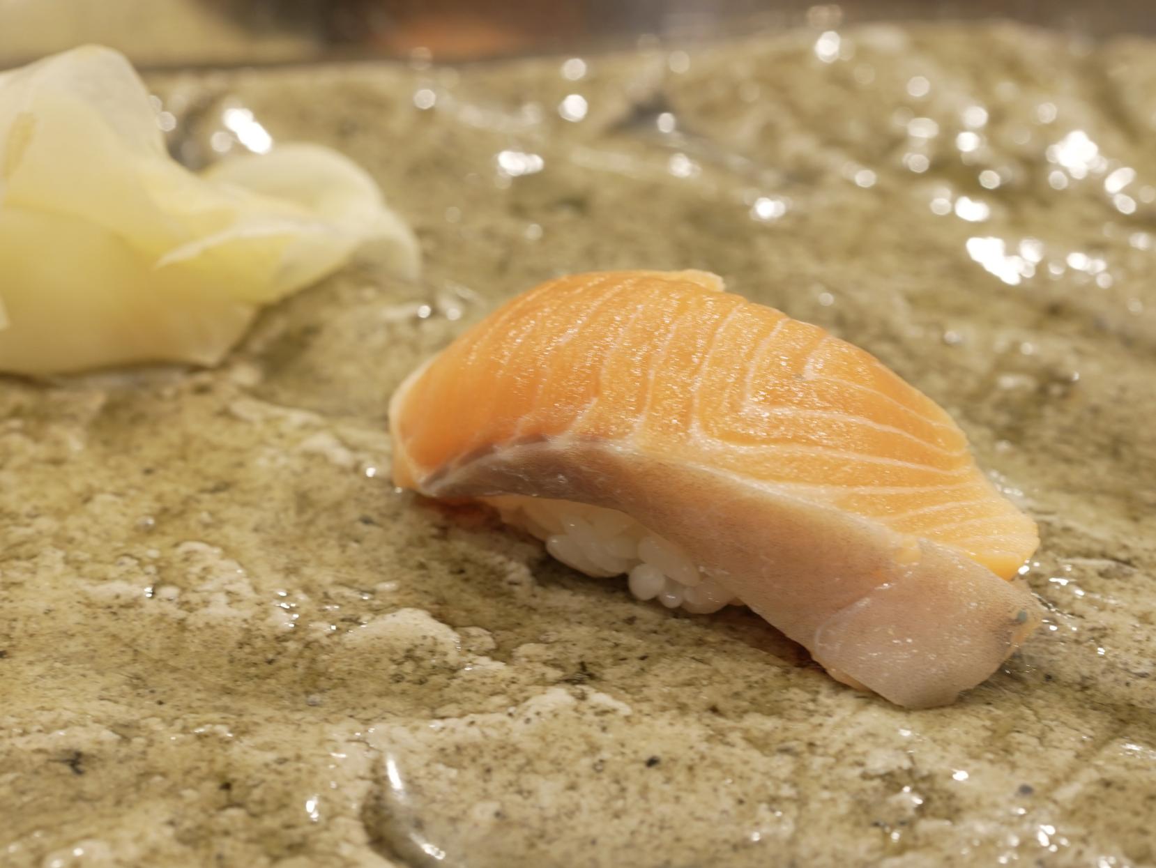 筆者イチオシは、、もう全部のネタが最高なんですが、あえて一つ挙げるならばサクラマス。輸入や養殖でも美味しくいただける昨今のマス市場ですが、天然物は一味も二味も違います!美しいピンクの切り身も素敵。