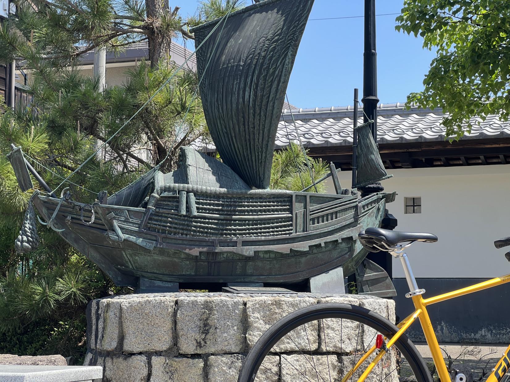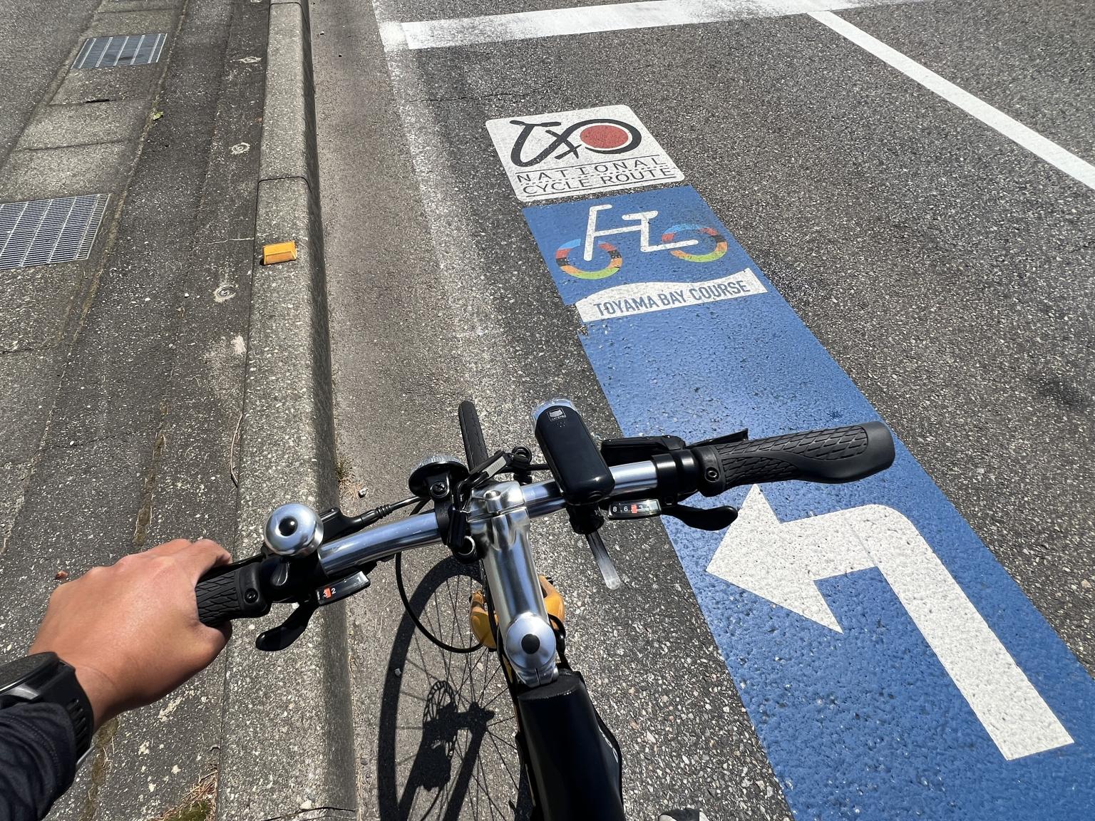 路肩にブルーラインの引かれた「富山湾岸サイクリングルート」を伝い、30分ほどかけて岩瀬エリアに到着しました。