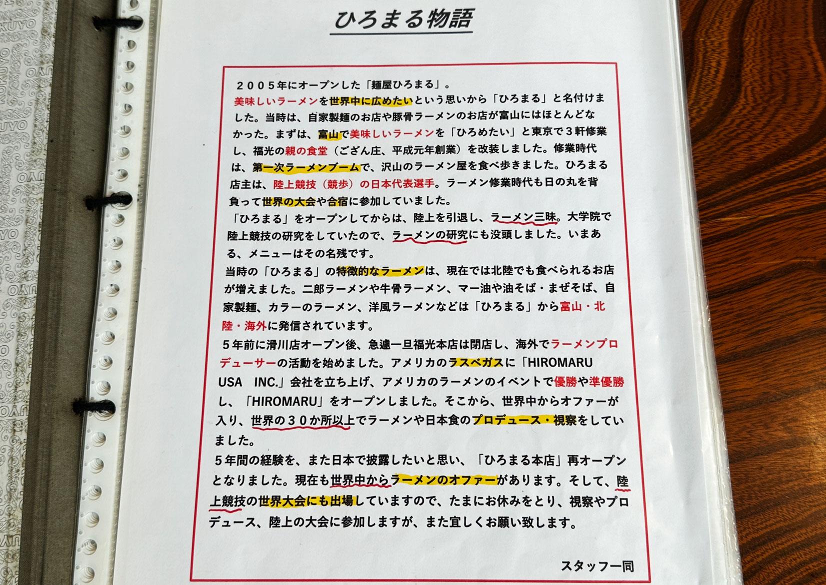 メニューが学校の出席簿風に作られており、ただのメニューではなく「麺屋ひろまる」の歴史も分かる読み物になっています。