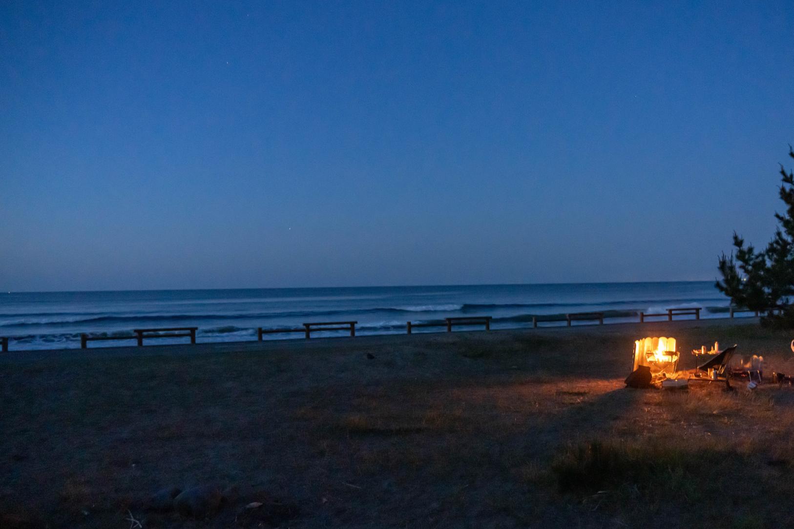 私は人気のない場所でソロキャンプを楽しみました。 波の音と焚火の音で落ち着きます。