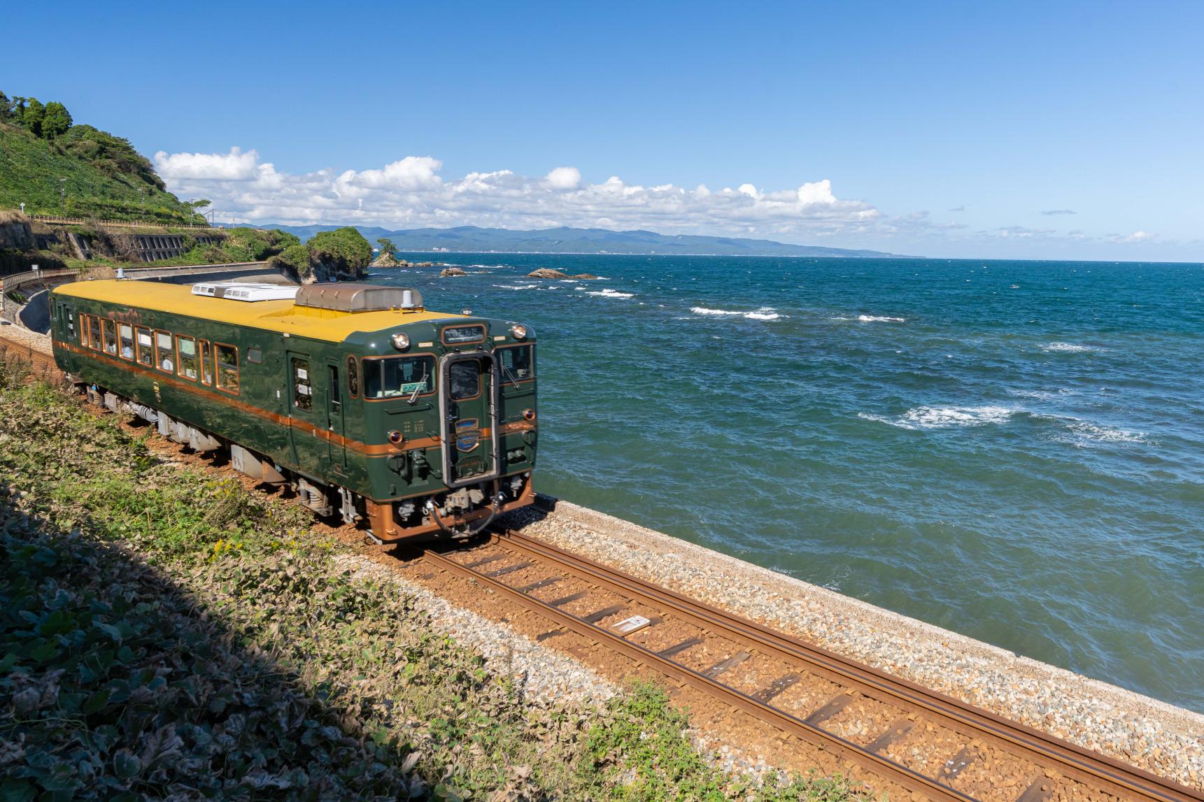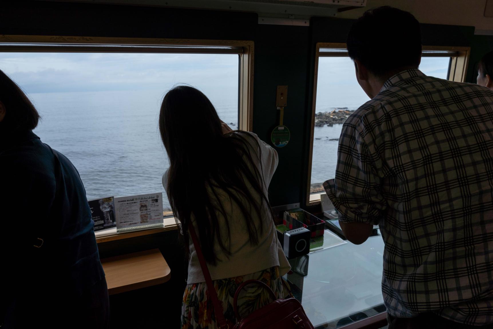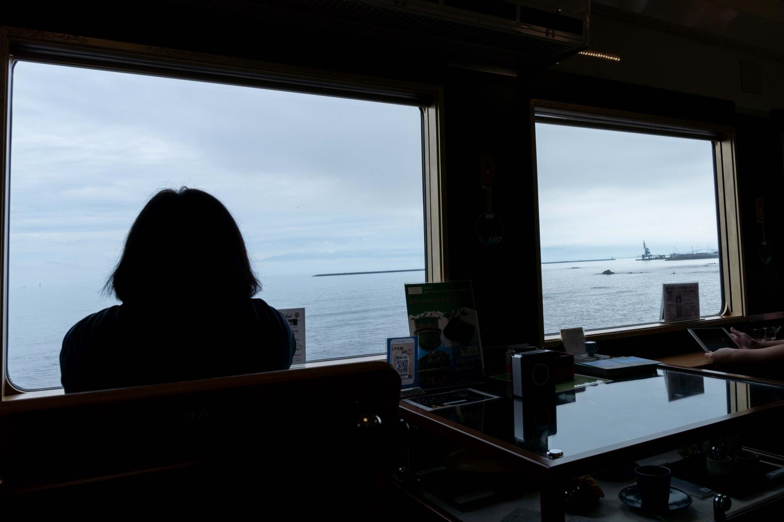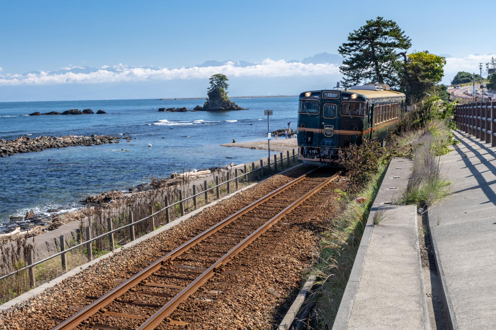 伏木駅を過ぎてしばらくすると、海沿いを走ります。私が乗車した日は生憎の天気でしたが、タイミングがあえば世界でも稀な「海越しの3,000m級の山々」の絶景を見る事が出来ます。また、見晴らしがよい場所でしばらく停車して景色を見せてくれたのも観光列車ならでは、と思いました。