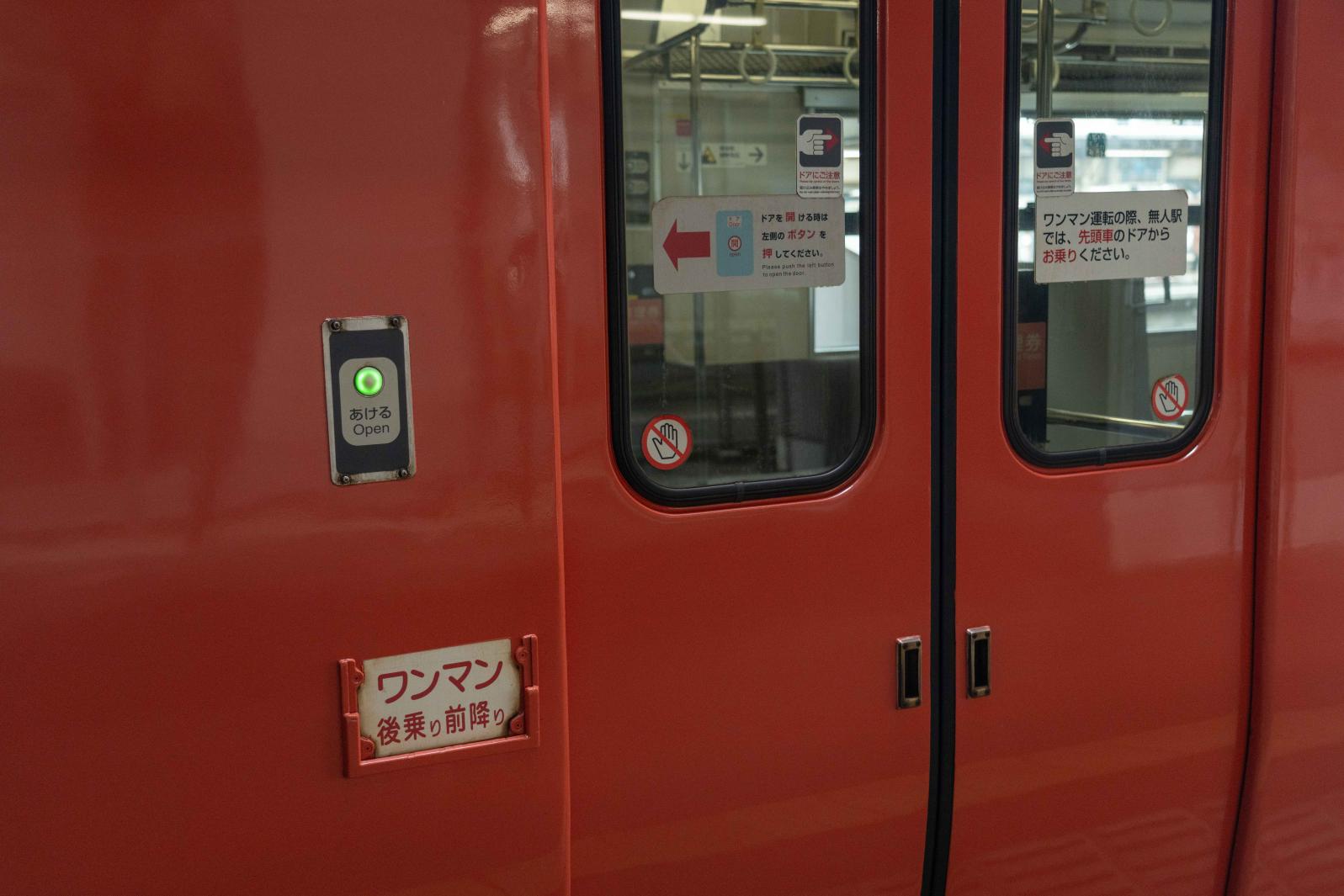 乗降者の際は、列車内外にボタンがありますので押して扉を開け閉めします。