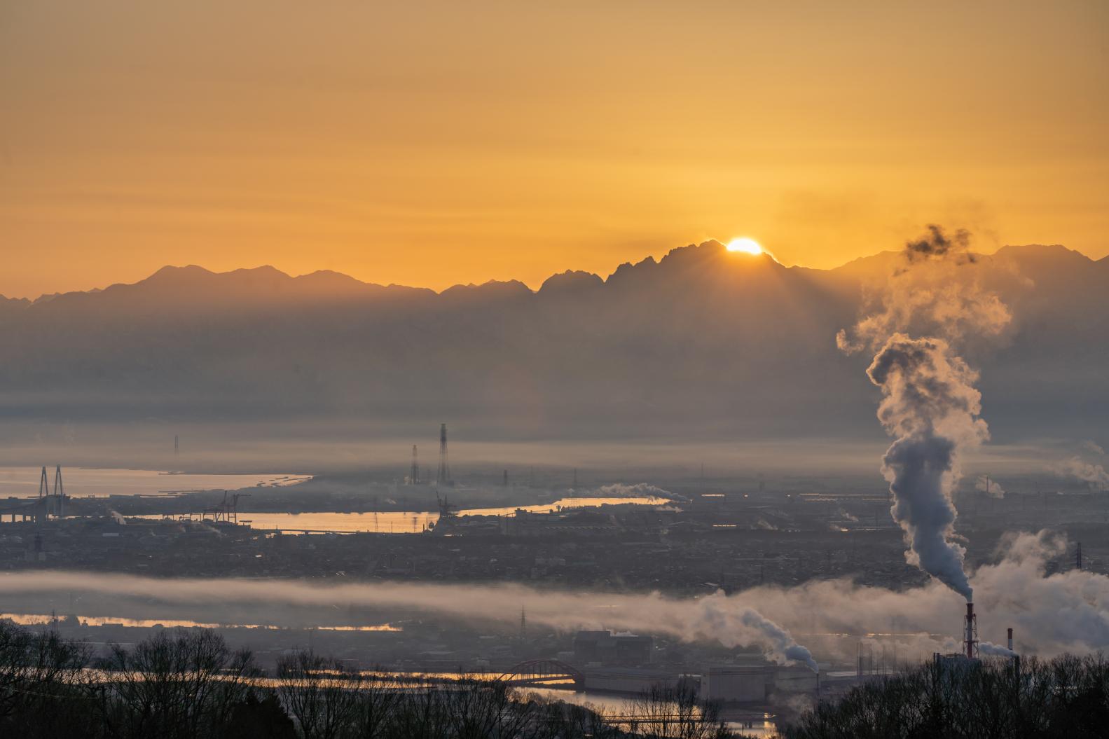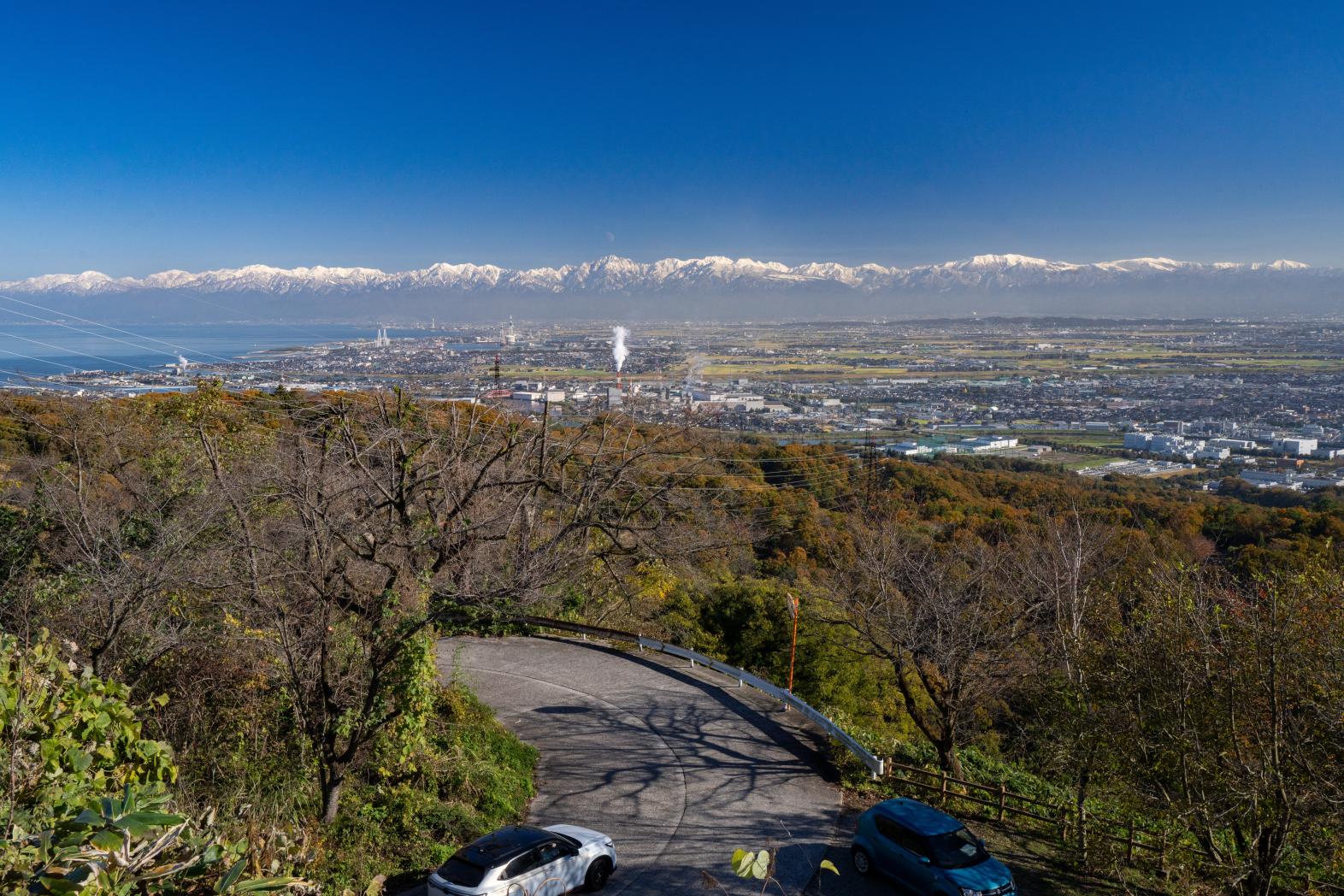 立山連峰スポットとしても素晴らしく、麓の高岡市から遠く立山連峰まで一望する事が出来ます。二上山にいくつかある展望所や道路沿いからも眺める事ができますが、特に私のお気に入りは「城山園地(しろやまえんち)の展望所」と「その少し東側の道路沿い」からの眺めです。