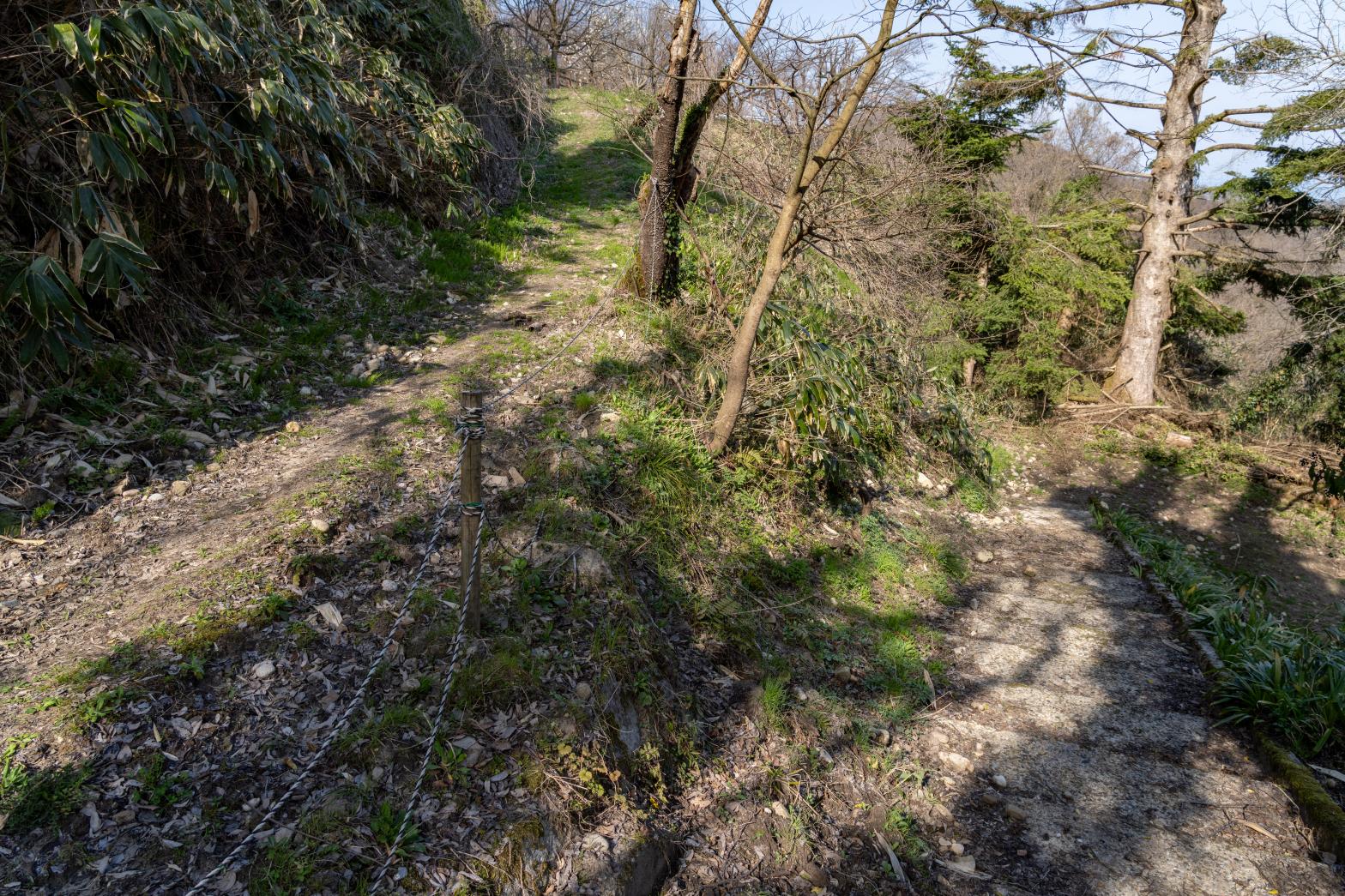 現在の「城山園地」のあたりが本丸で、そこから階段を下ると石垣などお城の面影が確認できます。復元された城跡ではありませんが、散策しやすいので歴史好きなら思いをはせてみてください。