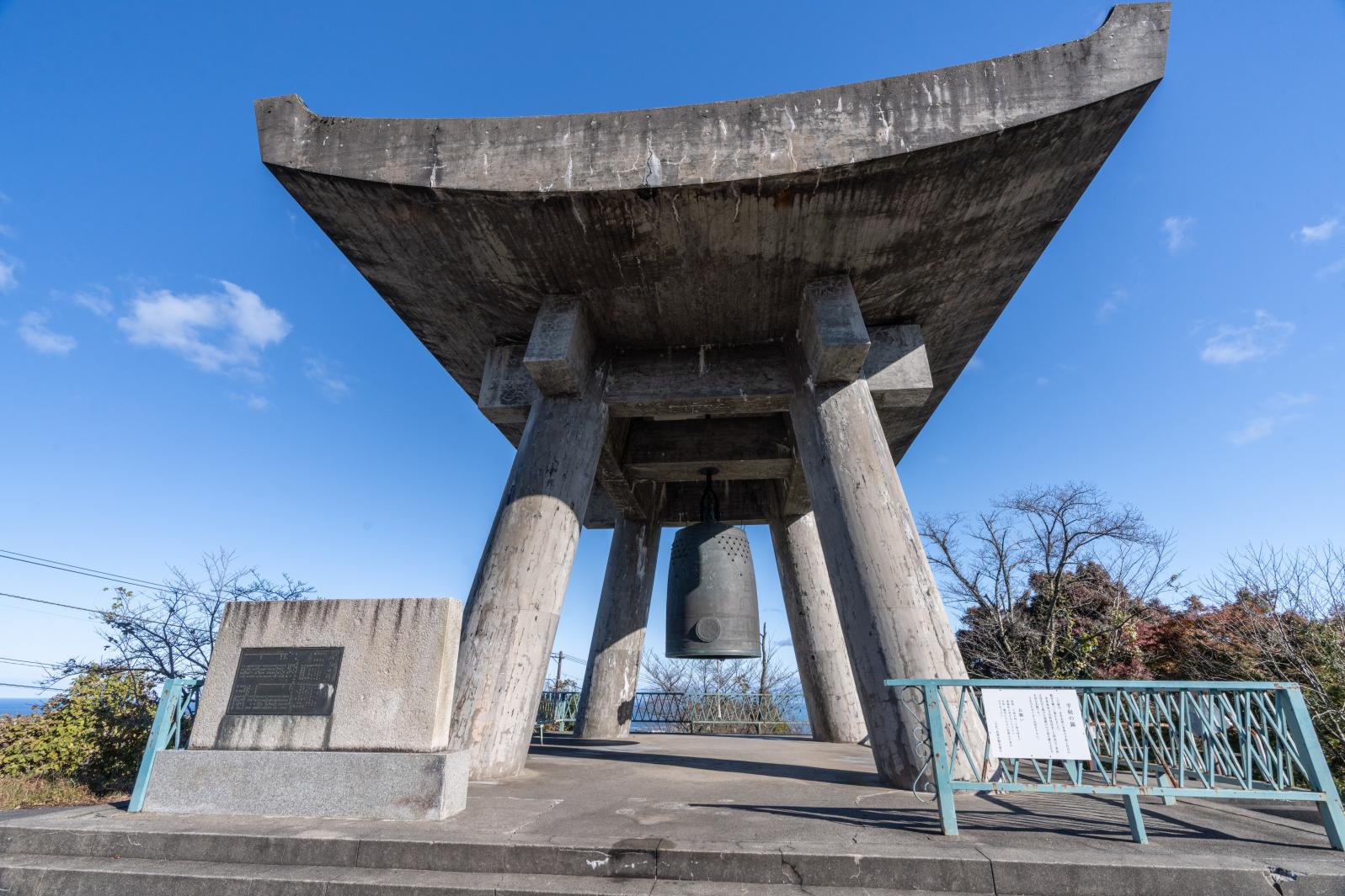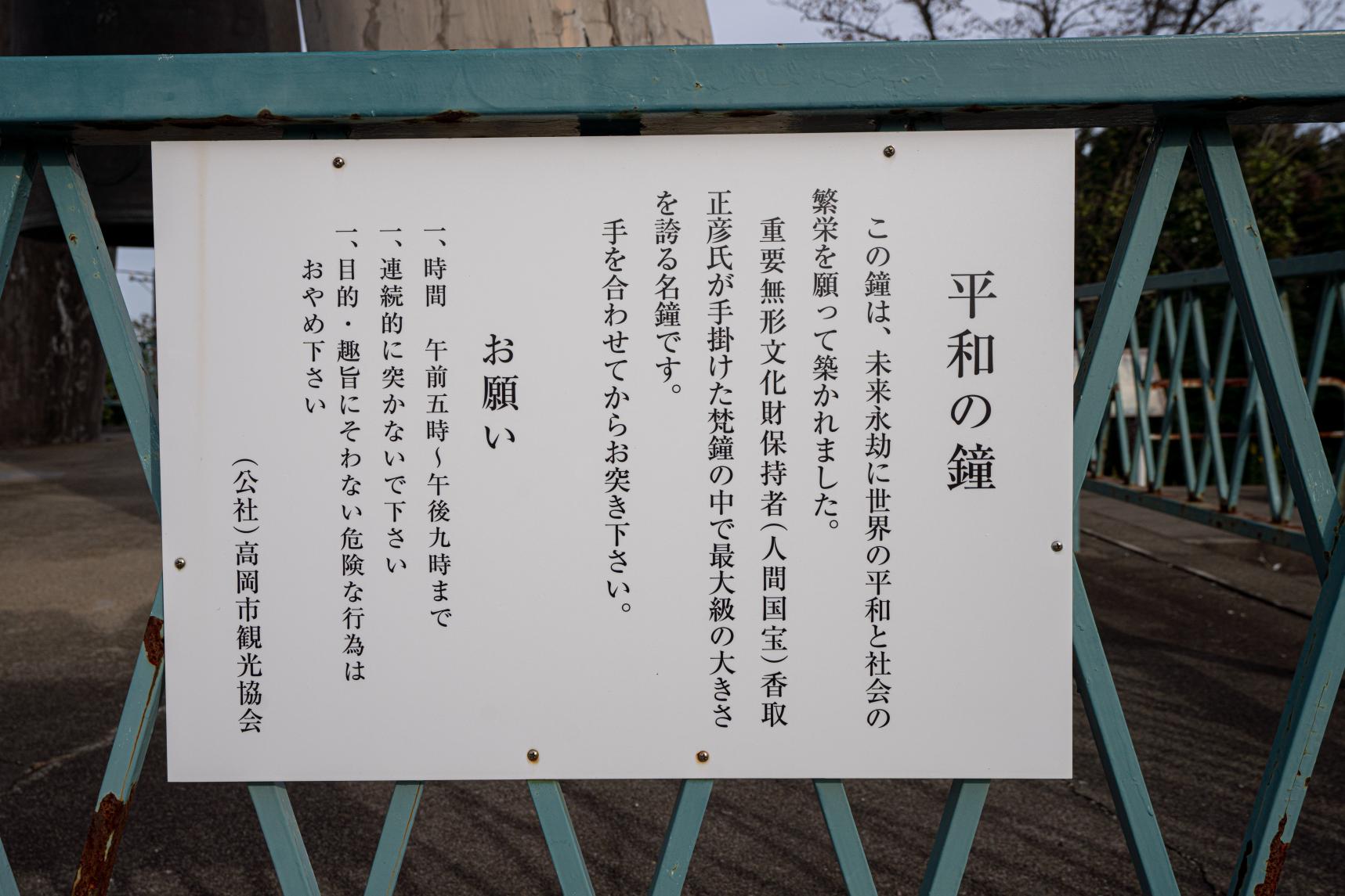 「平和の鐘」は高岡の伝統工芸「高岡銅器」の技術で造られ、誰でもつける鐘としては国内最大級の大きさの鐘だそうです。二上山に来たら突いてみましょう!