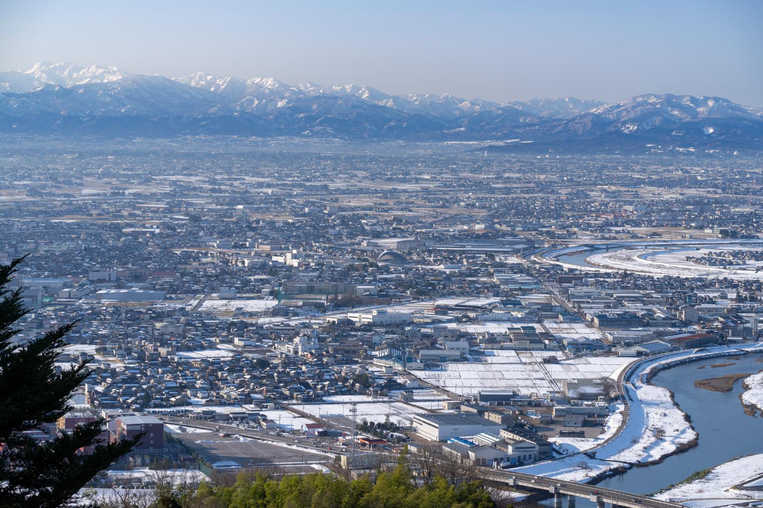 また、「立山連峰」ばかりに目が行ってしまいますが、南西方向を見てみると日本三名山の「白山(はくさん)」も見ることが出来ます。おすすめですので、ぜひこちらの方向も見てください。小矢部川(おやべがわ)の蛇行も上から見ることができ面白いです。