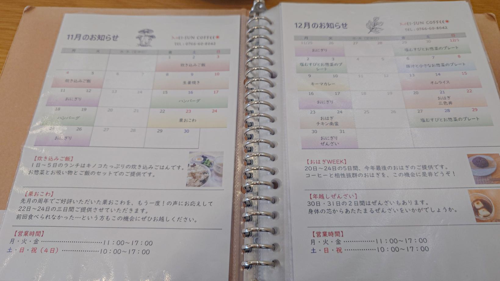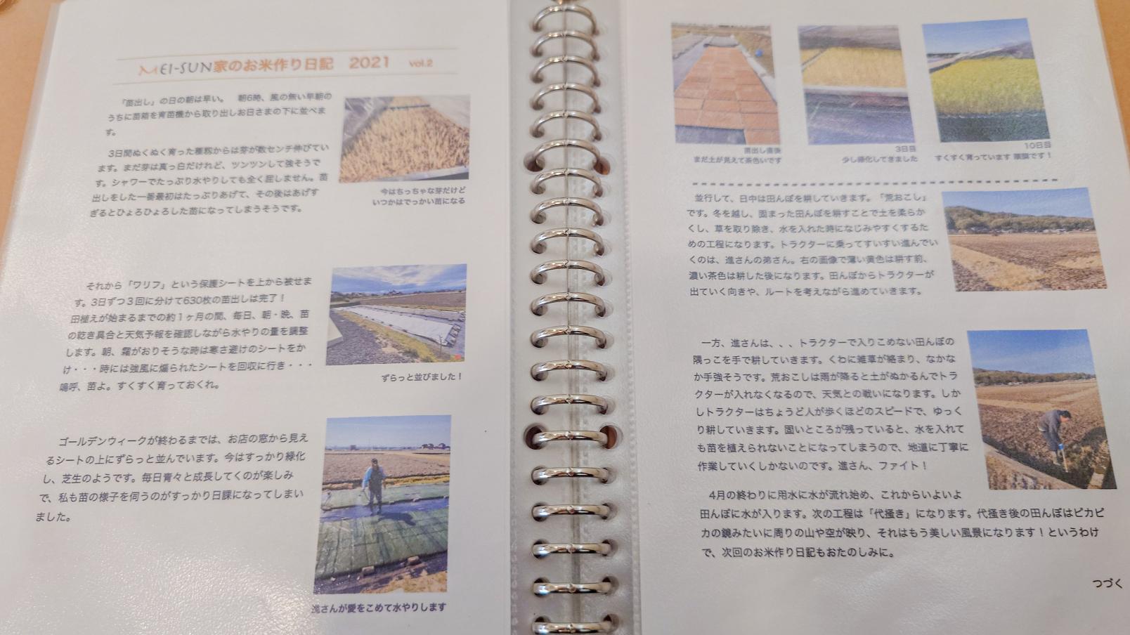 現在もたくさんの田んぼでお米作りをされており、店内ではスペシャリティコーヒーやスイーツとあわせて週替わりのお米料理をいただく事が出来ます。また、メニュー表では「お米日記」として苗作りから収穫までの様子が紹介されています。